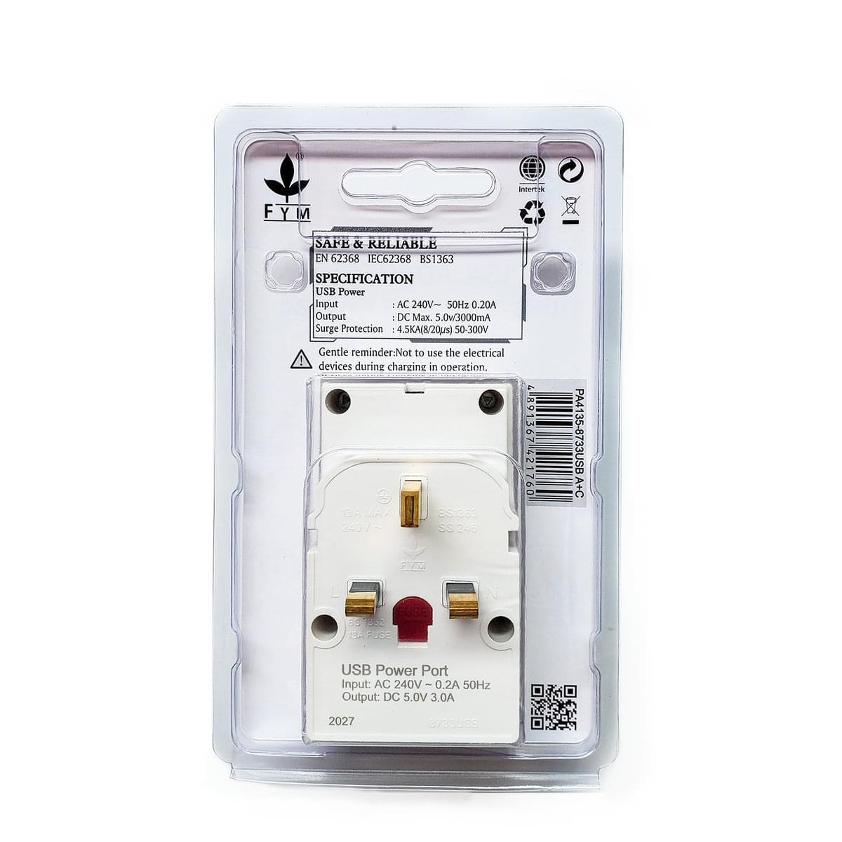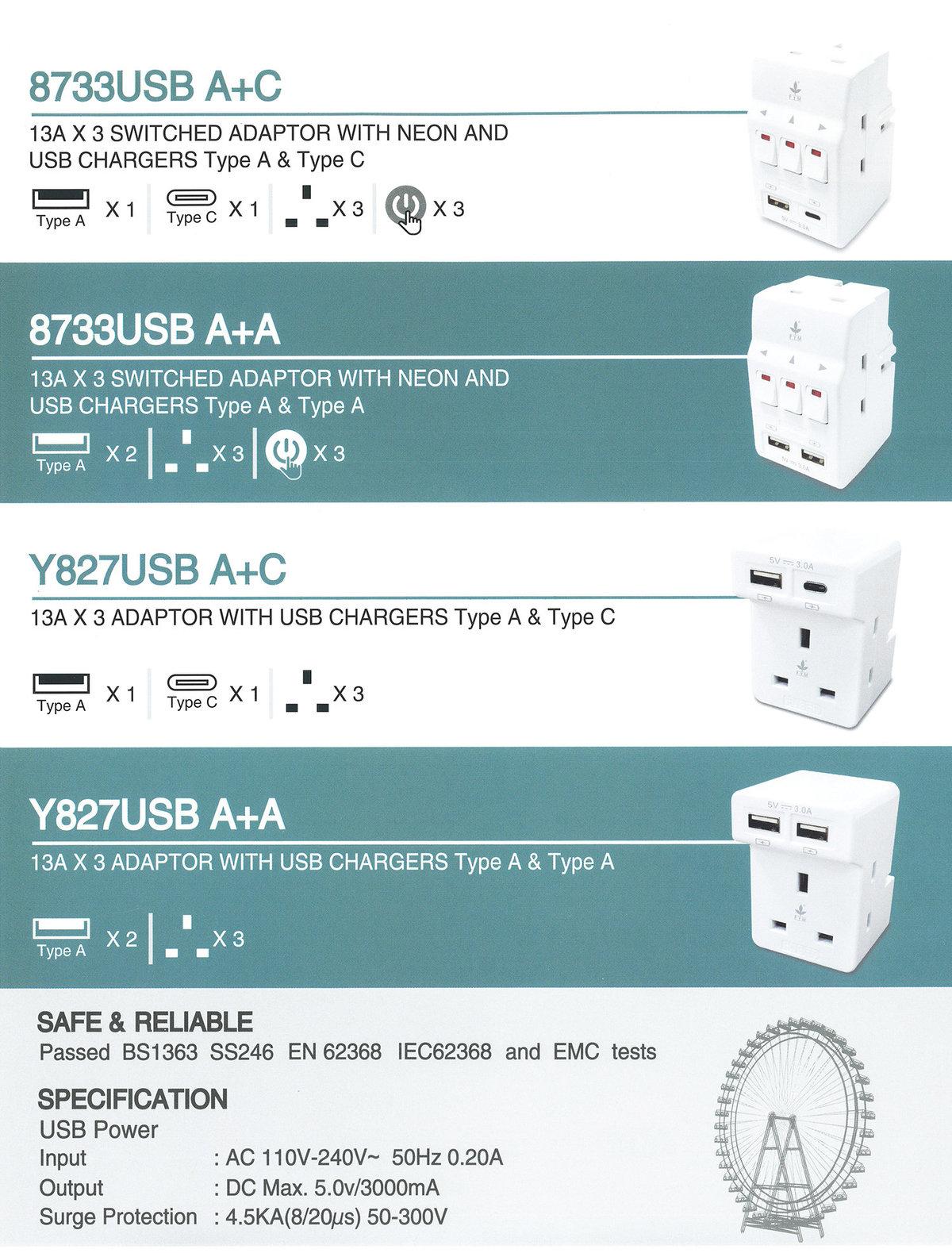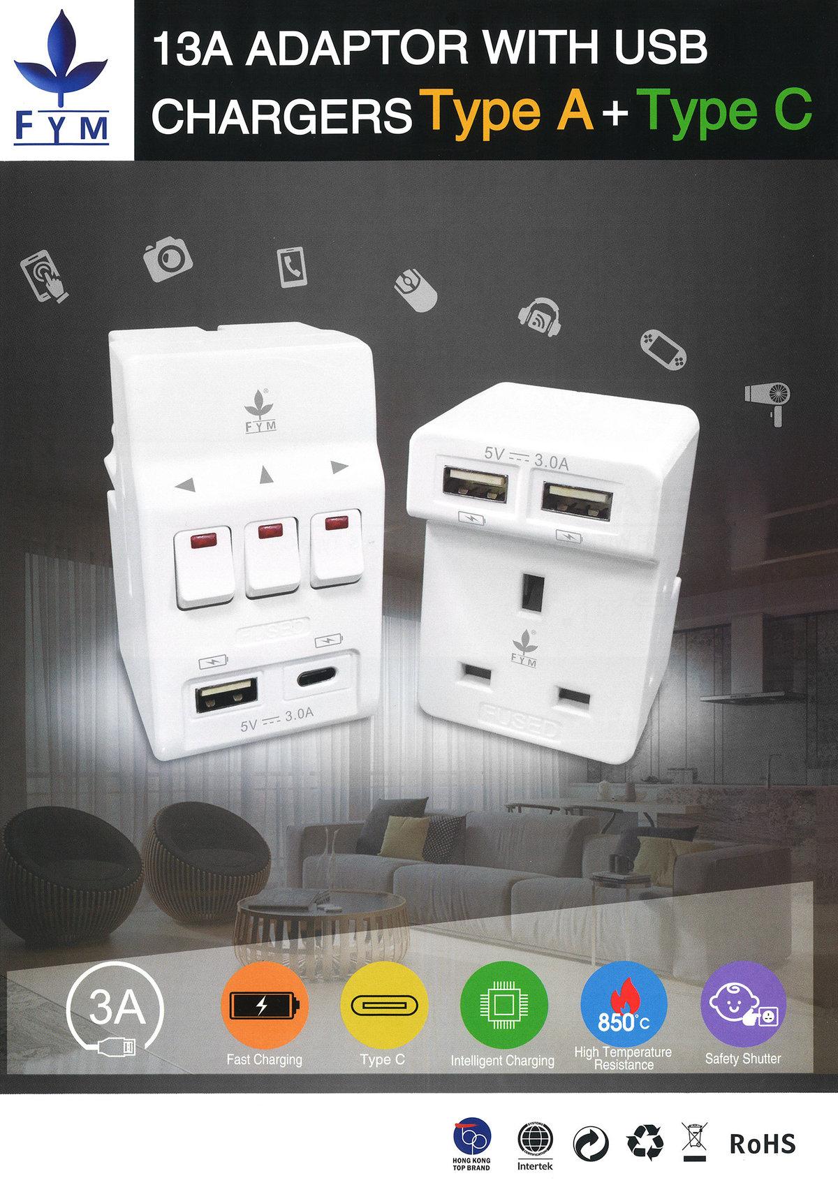 豊葉USB萬能插座(萬能插蘇),將3孔的13A萬能蘇與USB整合在一起,提供帶USB Type-A+A和USB Type-A+C,亦可以選擇帶獨立開關,款式全港最齊,最省位,最高性價比的產品。可為手機,平板電腦和其他USB設備供電。並帶防雷功能可保護寶貴的電氣設備免受脈衝的影響,並受到保護。