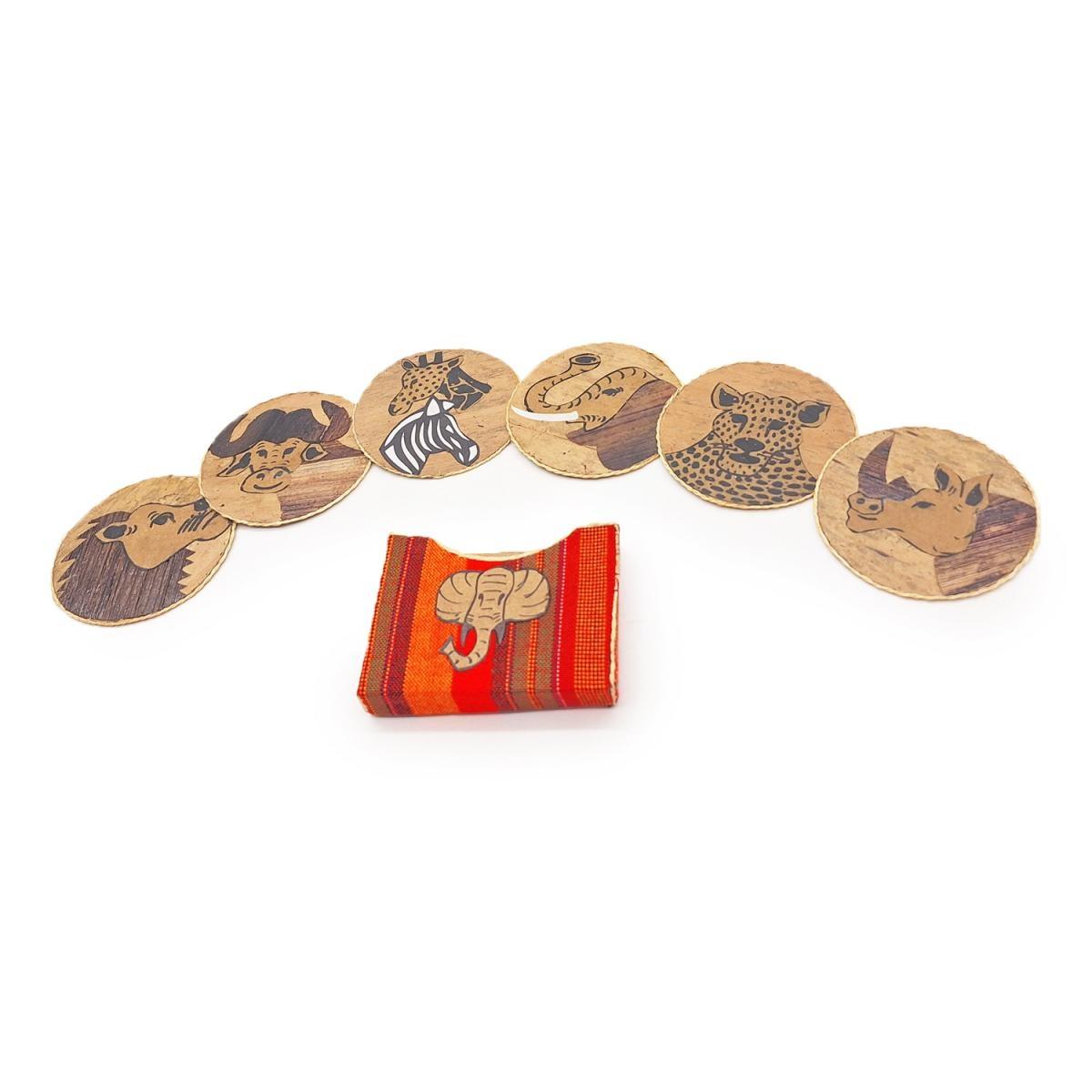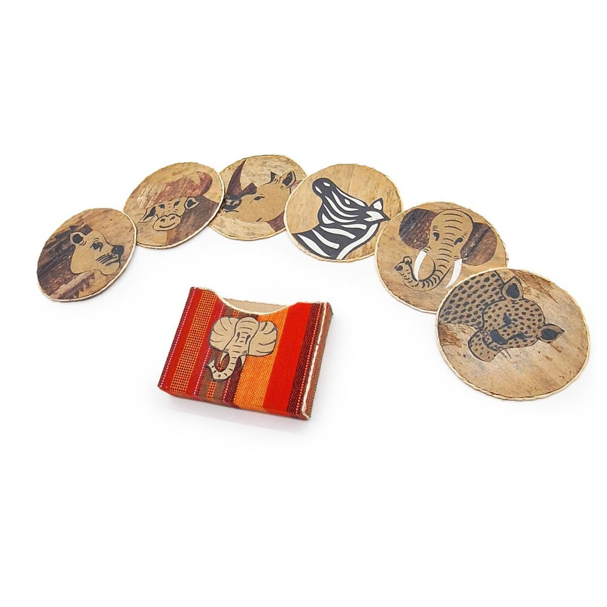 名稱 : 非洲大象圖案包附六片動物圖案杯墊 (AD-COASTER-ELEPHANT)呎吋 : 長9.4cm / 闊10.5cm / 高2cm(收納杯墊既盒)材質 : 木材特點 :--- 來自非洲的工藝品,六件組木製杯墊,刻有非洲動物圖案,附有配套設計的收納盒