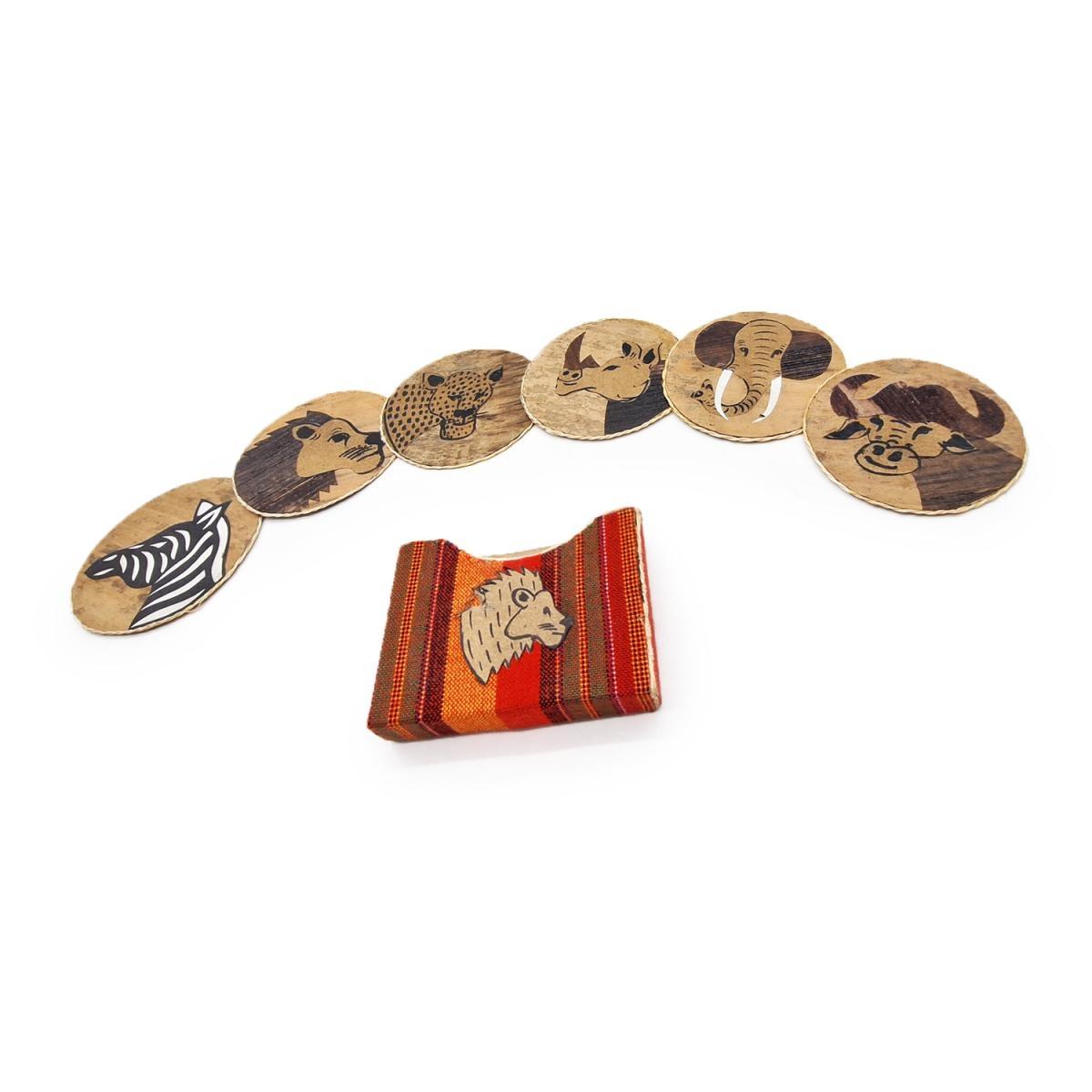 名稱 : 非洲獅子圖案包附六片動物圖案杯墊 (AD-COASTER-LION)呎吋 : 長9.4cm / 闊10.5cm / 高2cm(收納杯墊既盒)材質 : 木材特點 :--- 來自非洲的工藝品,六件組木製杯墊,刻有非洲動物圖案,附有配套設計的收納盒
