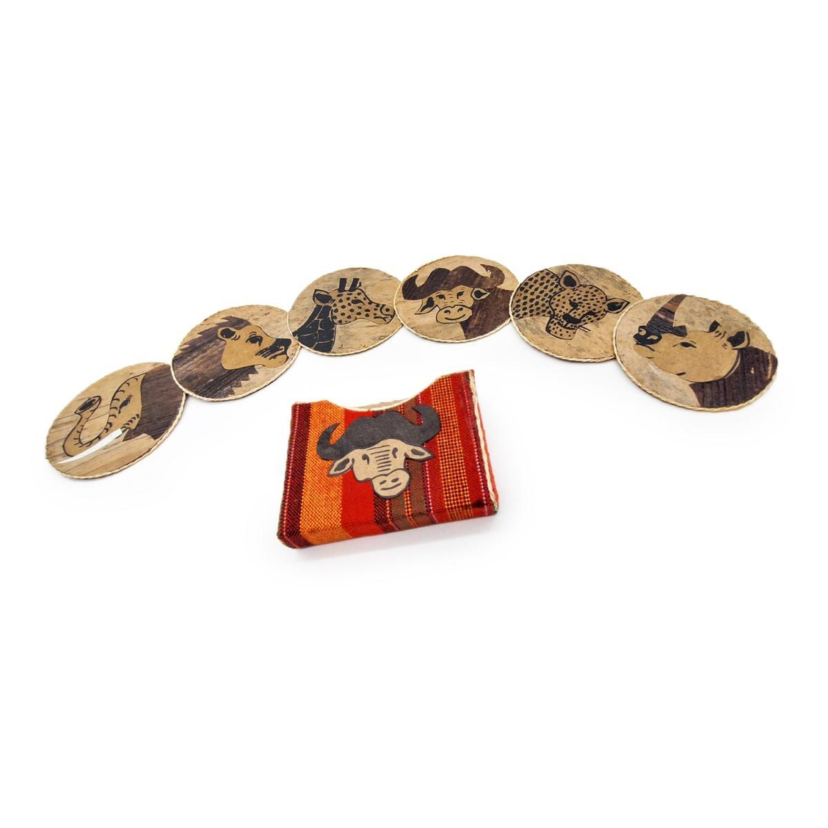 名稱 : 非洲牛圖案包附六片動物圖案杯墊 (AD-COASTER-OX)呎吋 : 長9.4cm / 闊10.5cm / 高2cm(收納杯墊既盒)材質 : 木材特點 :--- 來自非洲的工藝品,六件組木製杯墊,刻有非洲動物圖案,附有配套設計的收納盒