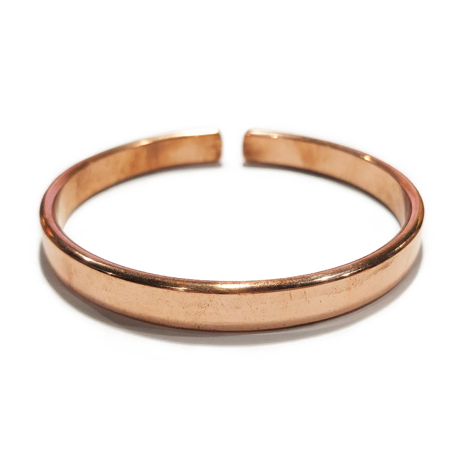 紅銅的顏色和玫瑰金很相似,沒有經過電鍍加工。坊間有許多銅手鈪都不是閉口的,而是做成開口,做成活口的目的除了讓它能適合更多不同手圍的顧客外,主要原因是銅手鐲的兩端會分別產生正磁性和負磁性,有利於身體的能量流動。