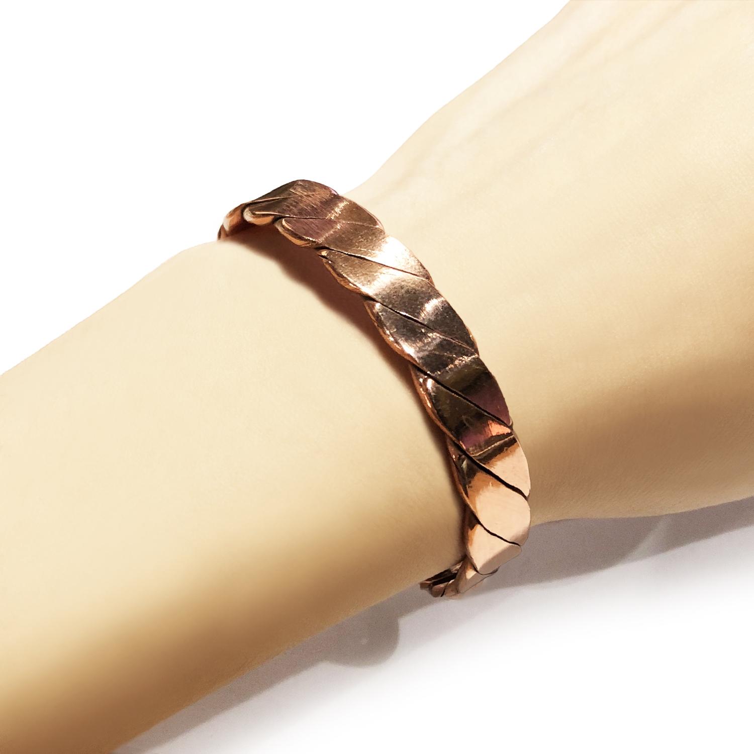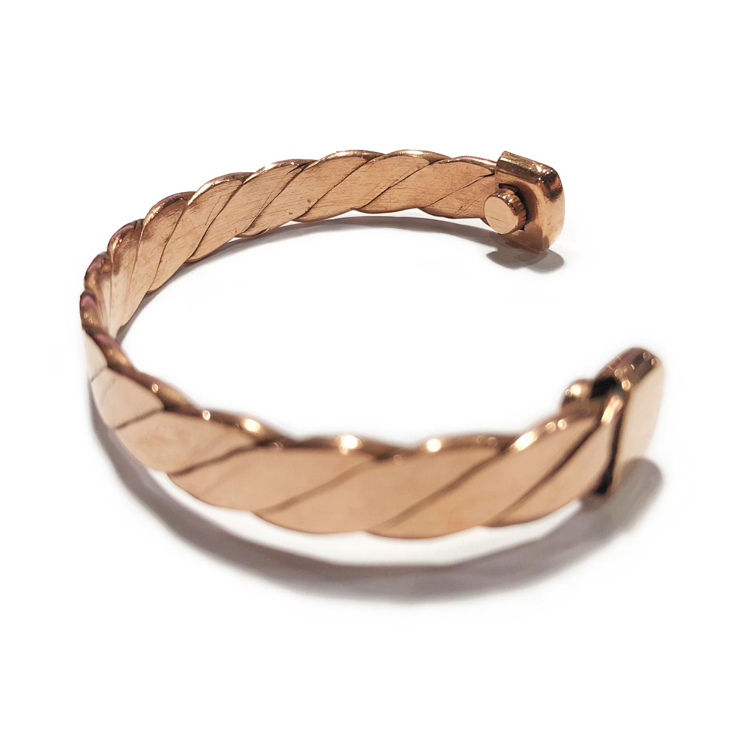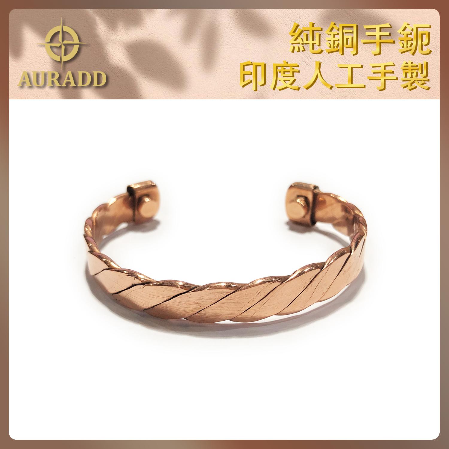 紅銅的顏色和玫瑰金很相似,沒有經過電鍍加工。坊間有許多銅手鈪都不是閉口的,而是做成開口,做成活口的目的除了讓它能適合更多不同手圍的顧客外,主要原因是銅手鐲的兩端會分別產生正磁性和負磁性,有利於身體的能量流動。