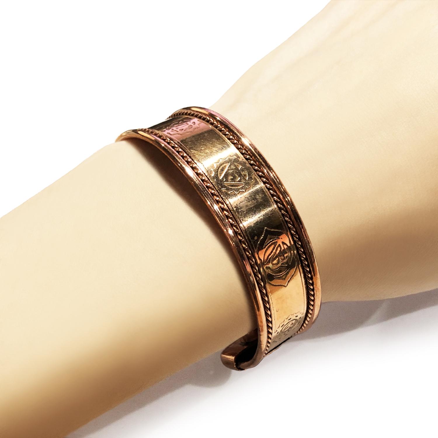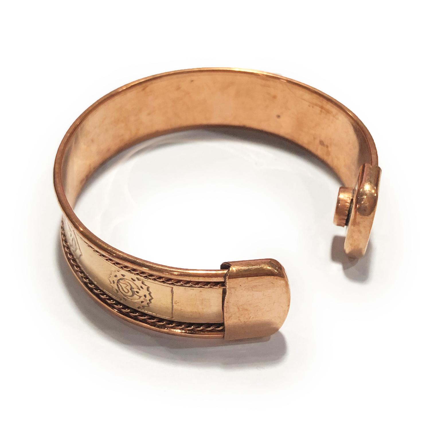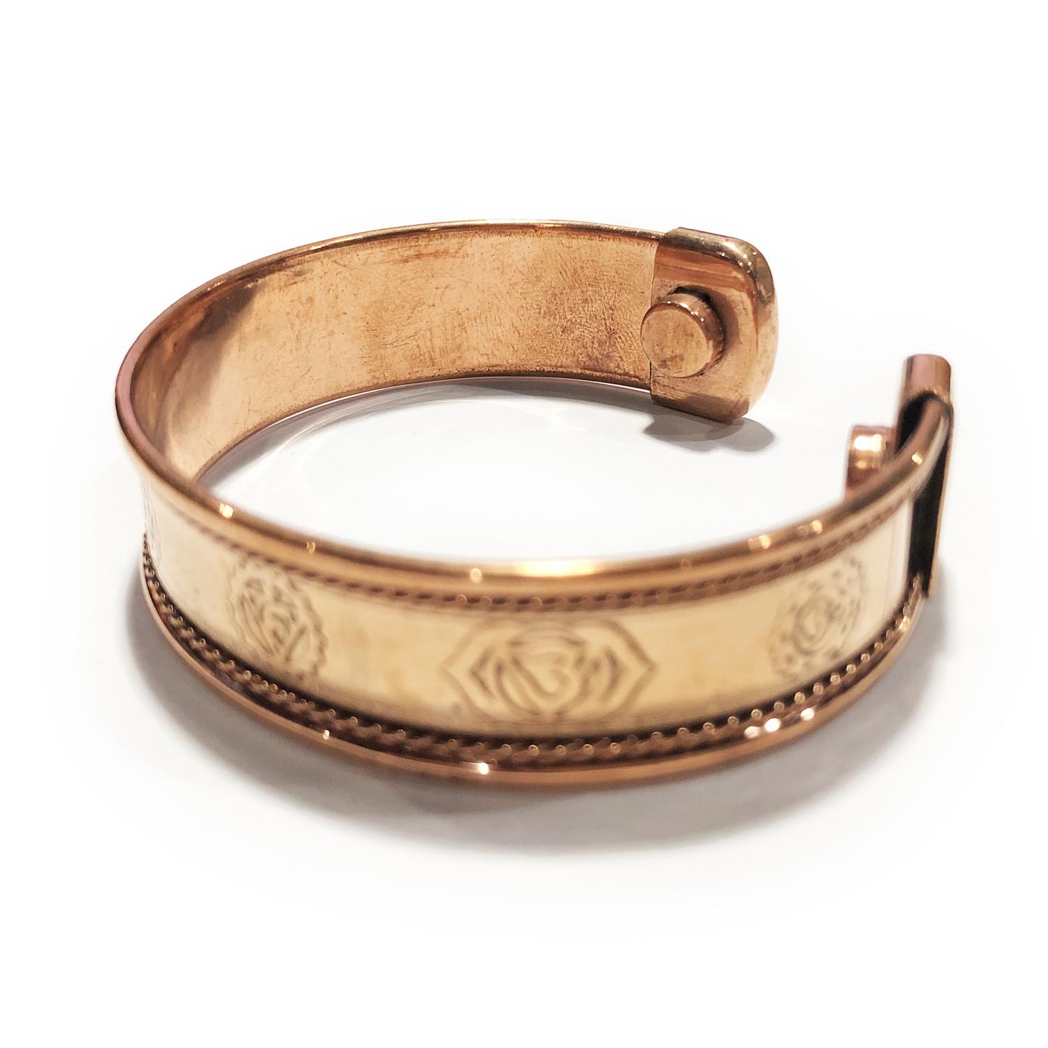 紅銅的顏色和玫瑰金很相似,沒有經過電鍍加工。坊間有許多銅手鈪都不是閉口的,而是做成開口,做成活口的目的除了讓它能適合更多不同手圍的顧客外,主要原因是銅手鐲的兩端會分別產生正磁性和負磁性,有利於身體的能量流動。