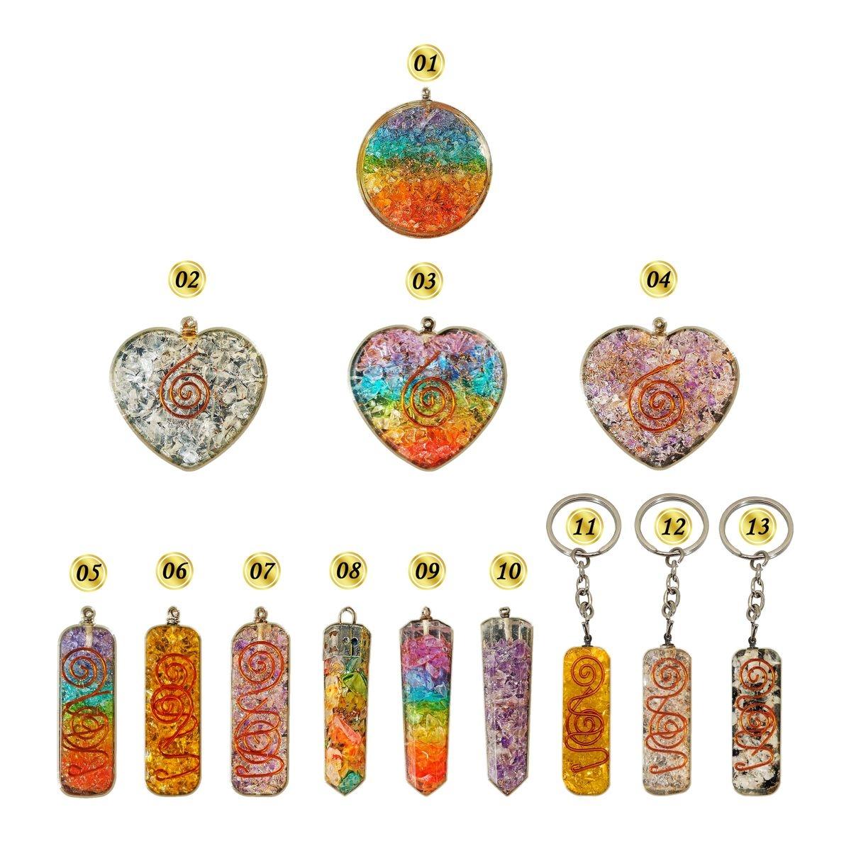 七脈輪ORGONITE水晶包含七個基本水晶來刺激七個脈輪中的每一個。包括用於基底脈輪的紅珊瑚、用於骶骨脈輪的紅玉髓、用於太陽神經叢的黃水晶、用於心輪的橄欖石、用於喉輪的綠松石、用於第三眼的青金石和用於皇冠脈輪的紫水晶。