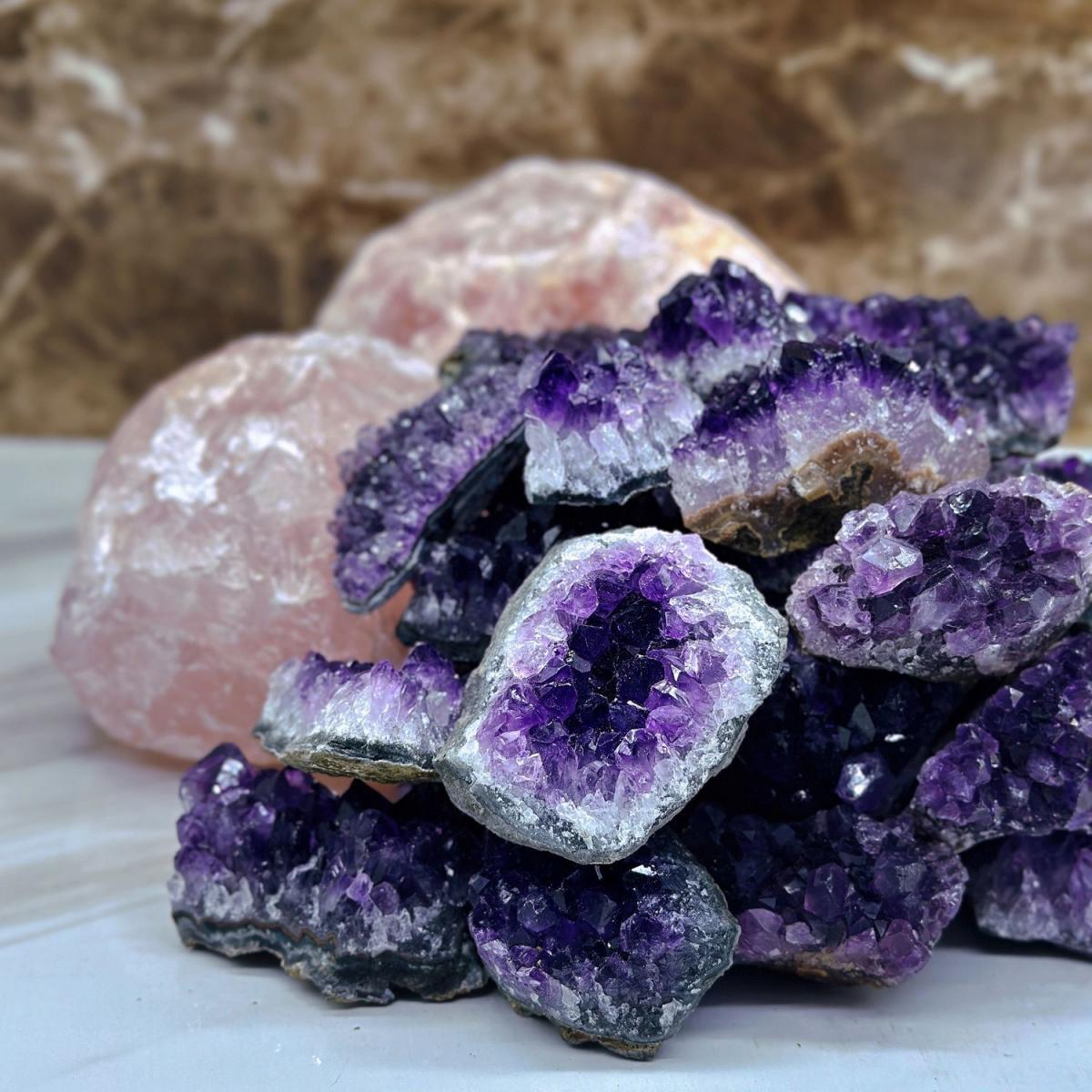 紫水晶簇是由多個紫水晶晶體生長在一起形成的。它們的外表極具吸引力,因而受到高度重視,並被認為與單一紫水晶晶體相比, 紫水晶簇具有加倍增強能量的特性。