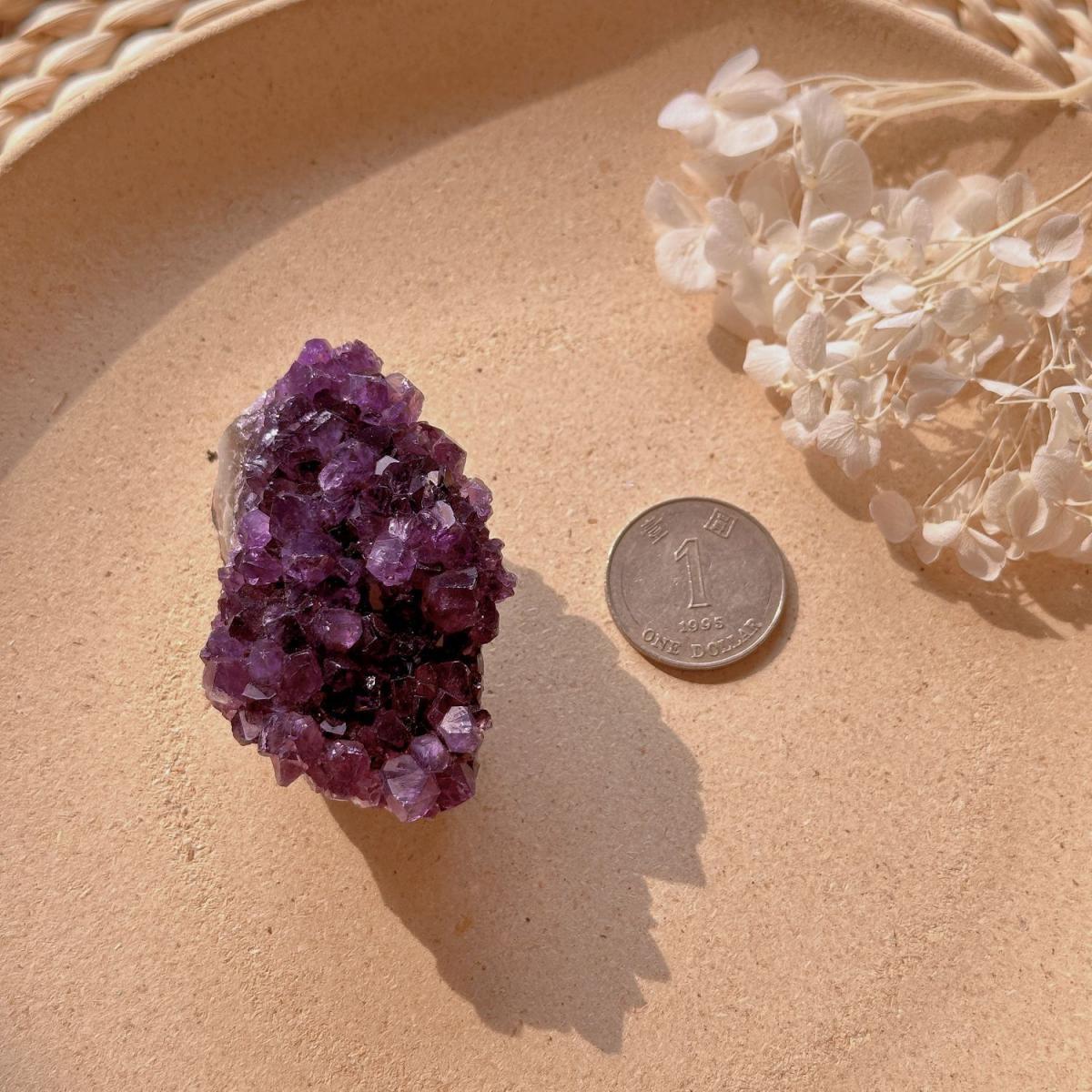 喚醒內在和直覺:紫水晶簇經常使用在冥想和精神治療中,它可以增強直覺、 喚醒內在以及連結更高領域。它可以刺激第三眼脈輪並強大內在成長和覺醒。
