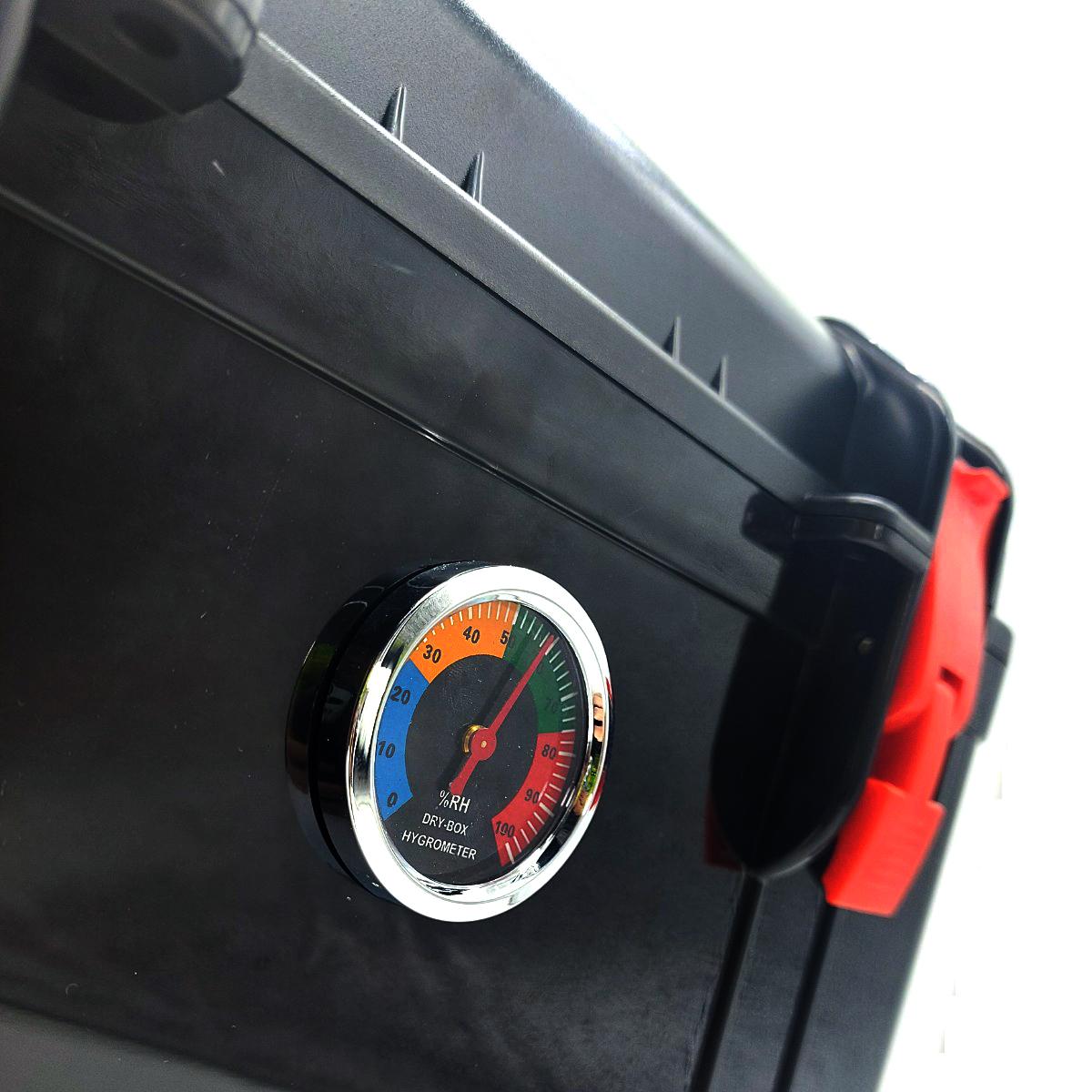 高精密濕度表:指針在25%~55%屬於正常範圍,高於55%就代表濕度偏高,需要更換箱內的吸濕器或重新插電除濕後再放回,建議選購可再重用的電子吸濕器。
