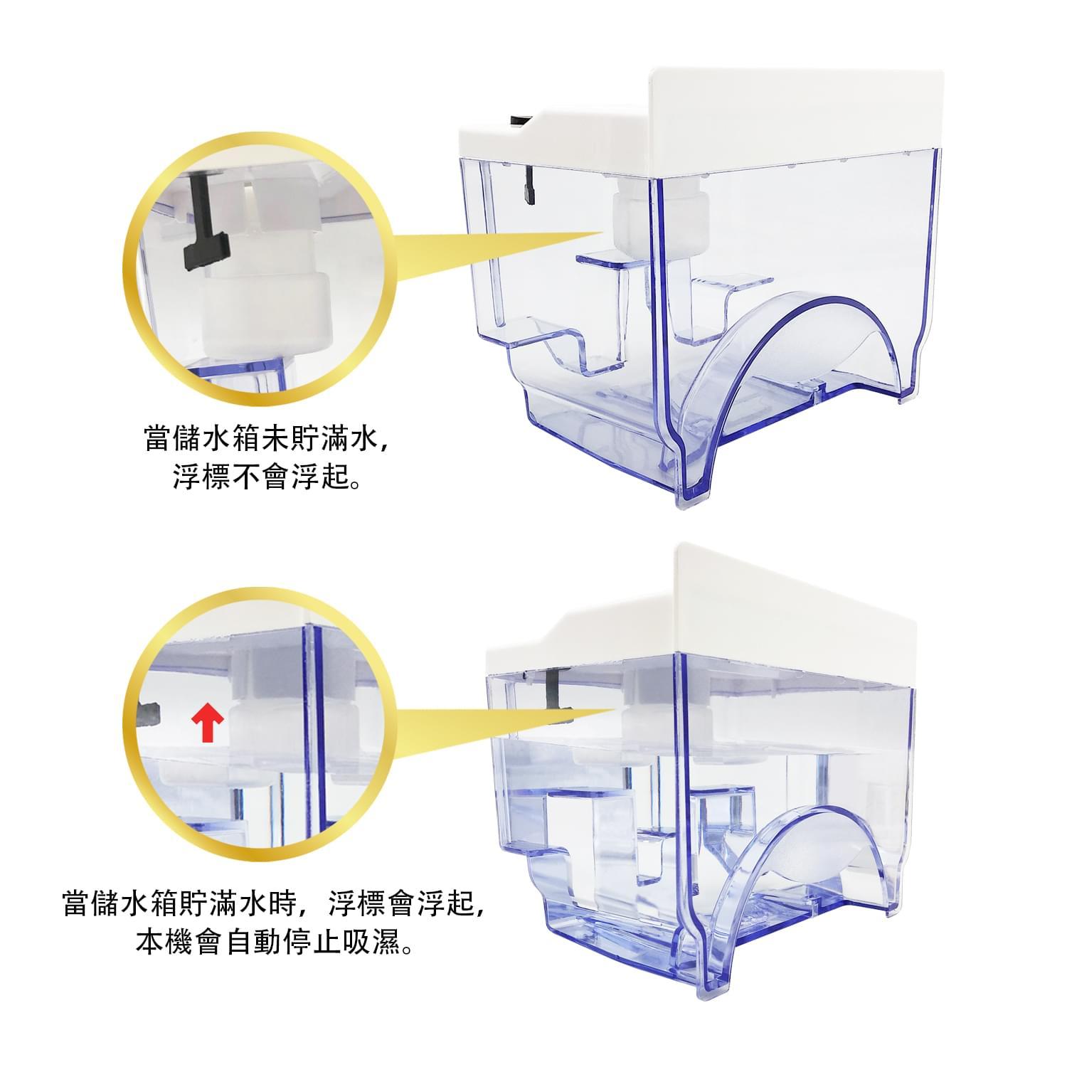 2. 當吸滿500ml的水後,本機會自動停止吸濕。請將機背的開關撥至OFF的位置後,再清空水箱中的水後,即可再次使用。