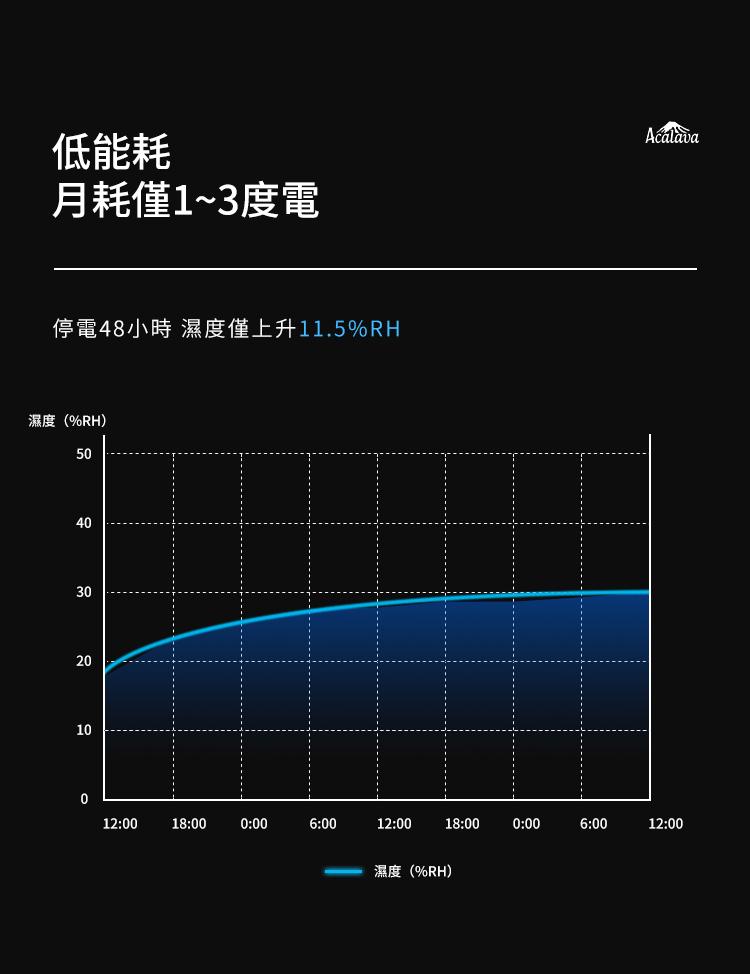 環保節能:低能耗設計,每月僅耗電1~3度,每天約1毫子電費。即使停電48小時,濕度上升約11.5%RH。