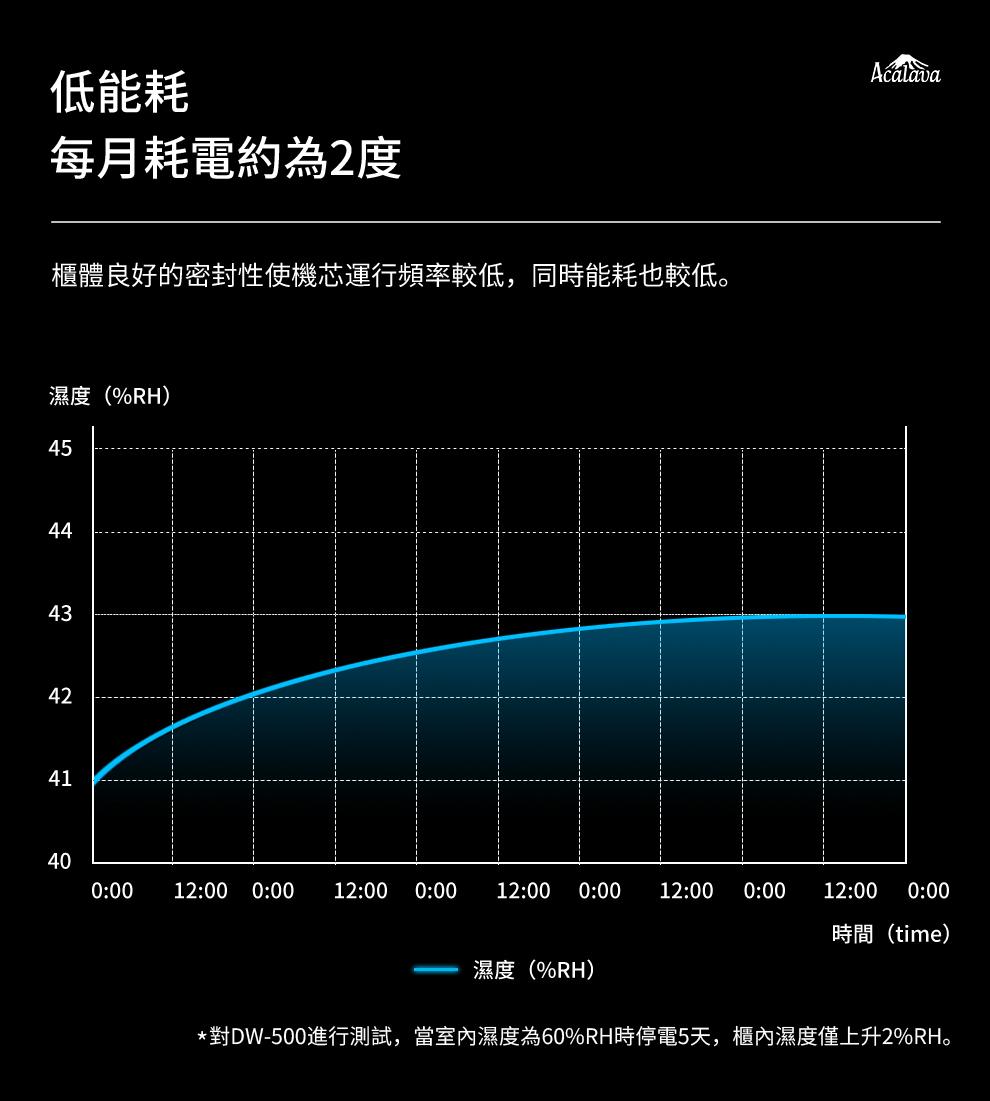 環保節能:低能耗設計,每月僅耗電1~3度,每天約1毫子電費。即使停電48小時,濕度上升約11.5%RH。