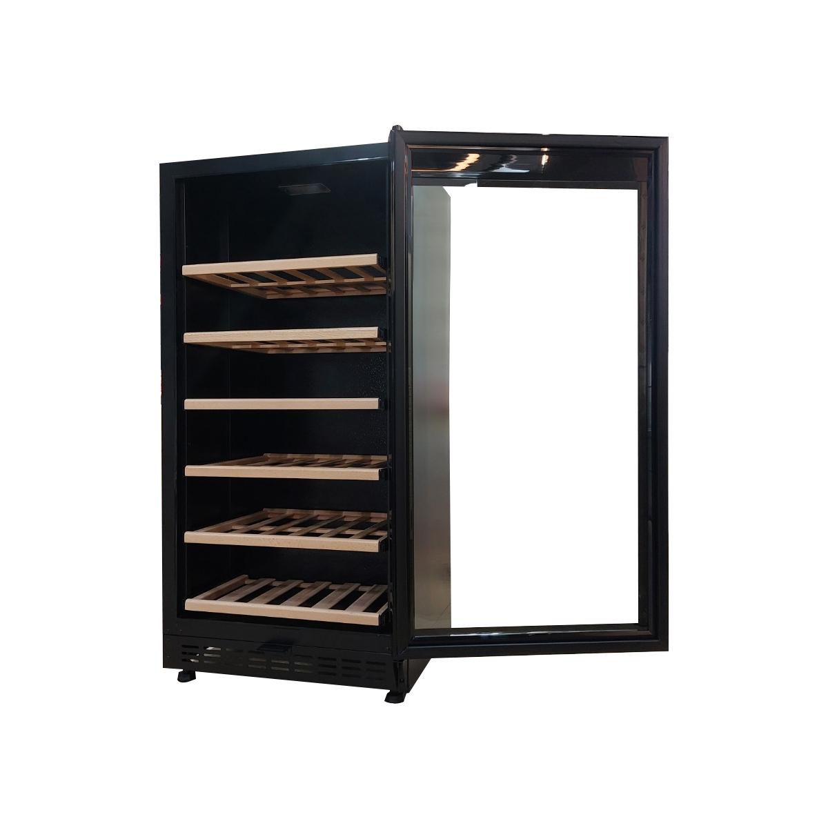 壓縮機酒櫃(利用蒸汽壓縮來達到所需溫度),為了達到冷卻效果,壓縮機將製冷劑氣體泵入製冷系統,製冷系統由許多元件組成,其中包括蒸發器和冷凝器。在設置良好的狀況下,壓縮機應安裝於酒櫃的主體上,並由能吸收振動的橡膠減震墊固定,這是為了避免任何振動傳導至紅酒。有些酒櫃會使用內部風扇來保持內部溫度均勻,有些則使用外部風扇把熱量從壓縮機中吹走。壓縮機可以使用許多種不同類型的製冷劑氣體,其中有些製冷劑氣體耗用的能源更少,本公司採用 R600a,同時還具有零臭氧消耗特性。