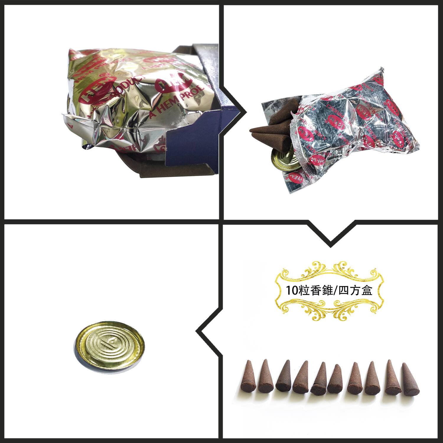 【包裝】每個四方盒內有10粒圓錐香,附送一塊小鐵片香座,供燃燒圓錐香時使用,建議採用本公司的香盒或香盤。