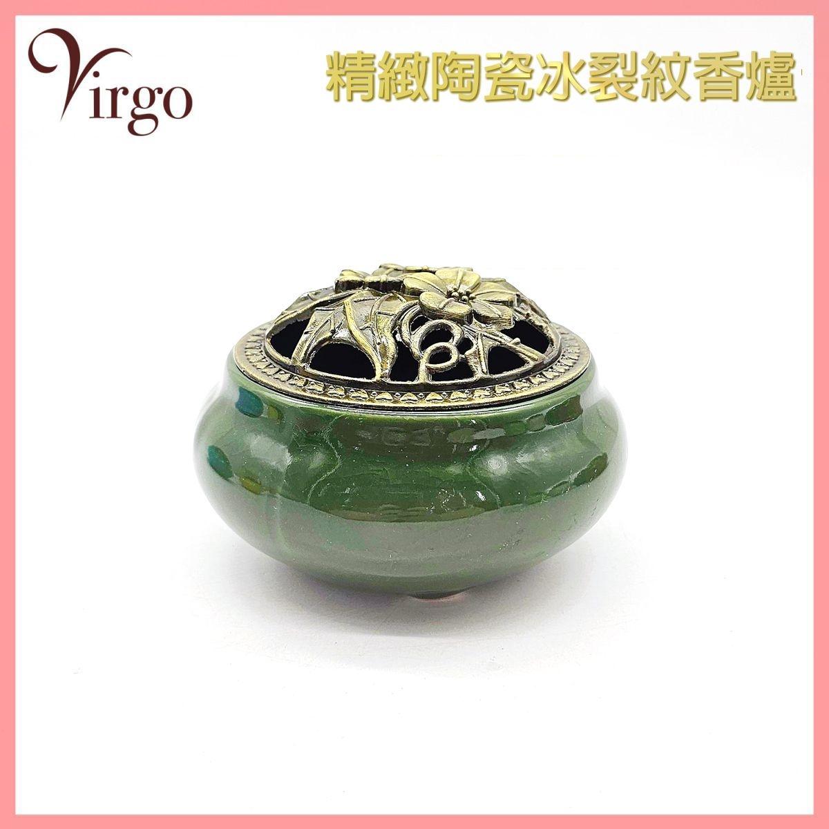 香具 香爐 深綠色精緻陶瓷冰裂紋香爐 小香爐 香薰香具 古典彩色鋅合金蓋混合陶瓷熏香爐 鏤空瓷器香爐 盤香爐 塔香燃燒 塔香爐 酥油燈座 香爐推薦 HIH-CERMIC-7CM-DARK-GREEN