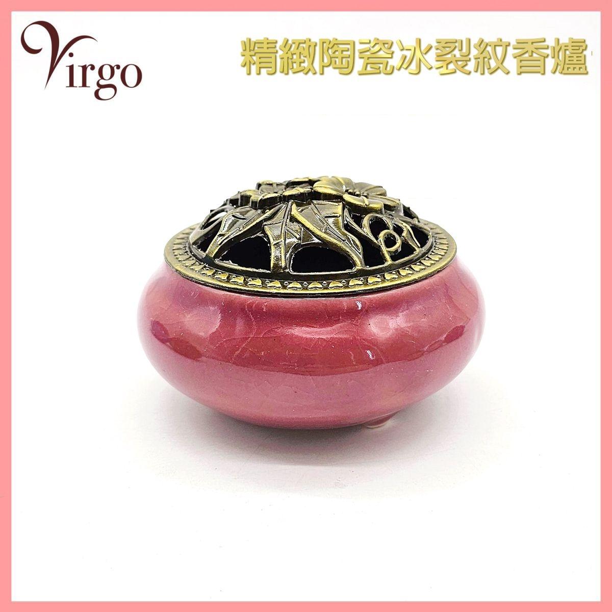 香具 香爐 紅色精緻陶瓷冰裂紋香爐 小香爐 香薰香具 古典彩色鋅合金蓋混合陶瓷熏香爐 鏤空瓷器香爐 盤香爐 塔香燃燒 塔香爐 酥油燈座 香爐推薦 禮物推薦 HIH-CERMIC-7CM-RED