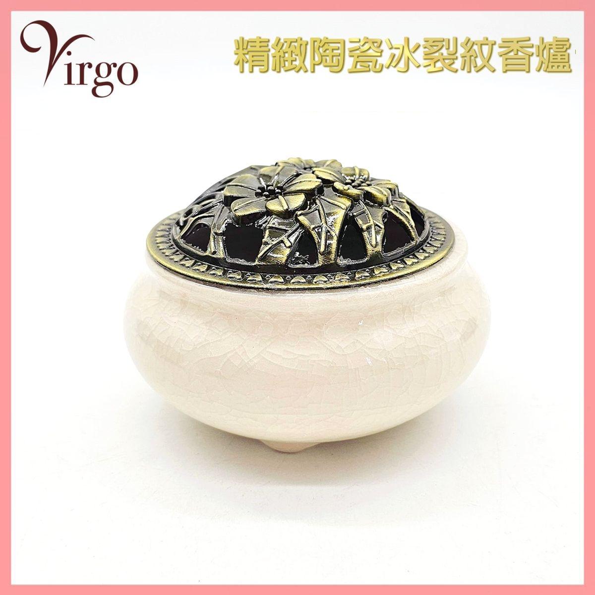 香具 香爐 白色精緻陶瓷冰裂紋香爐 小香爐 香薰香具 古典彩色鋅合金蓋混合陶瓷熏香爐 鏤空瓷器香爐 盤香爐 塔香燃燒 塔香爐 酥油燈座 香爐推薦 禮物推薦 HIH-CERMIC-7CM-WHITE