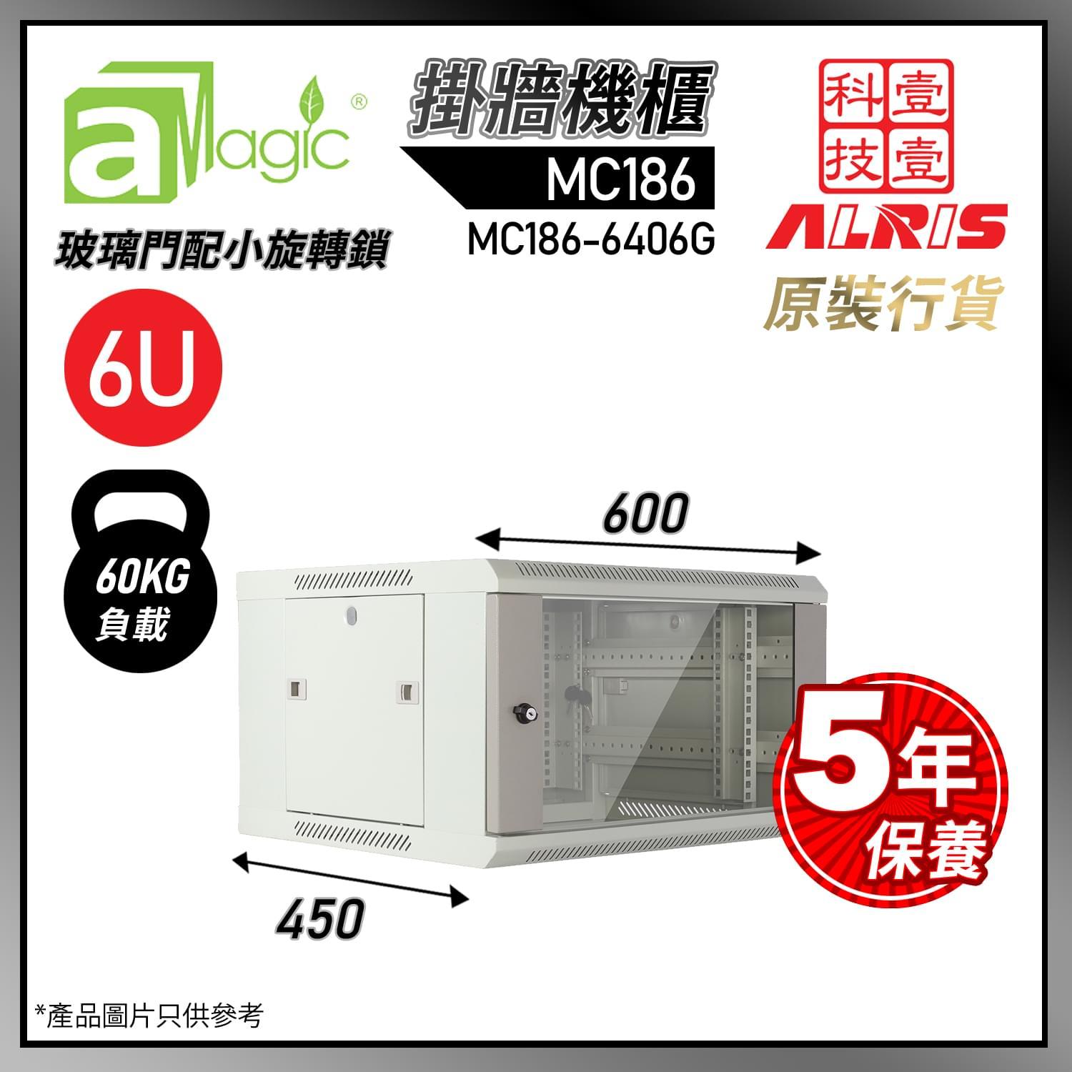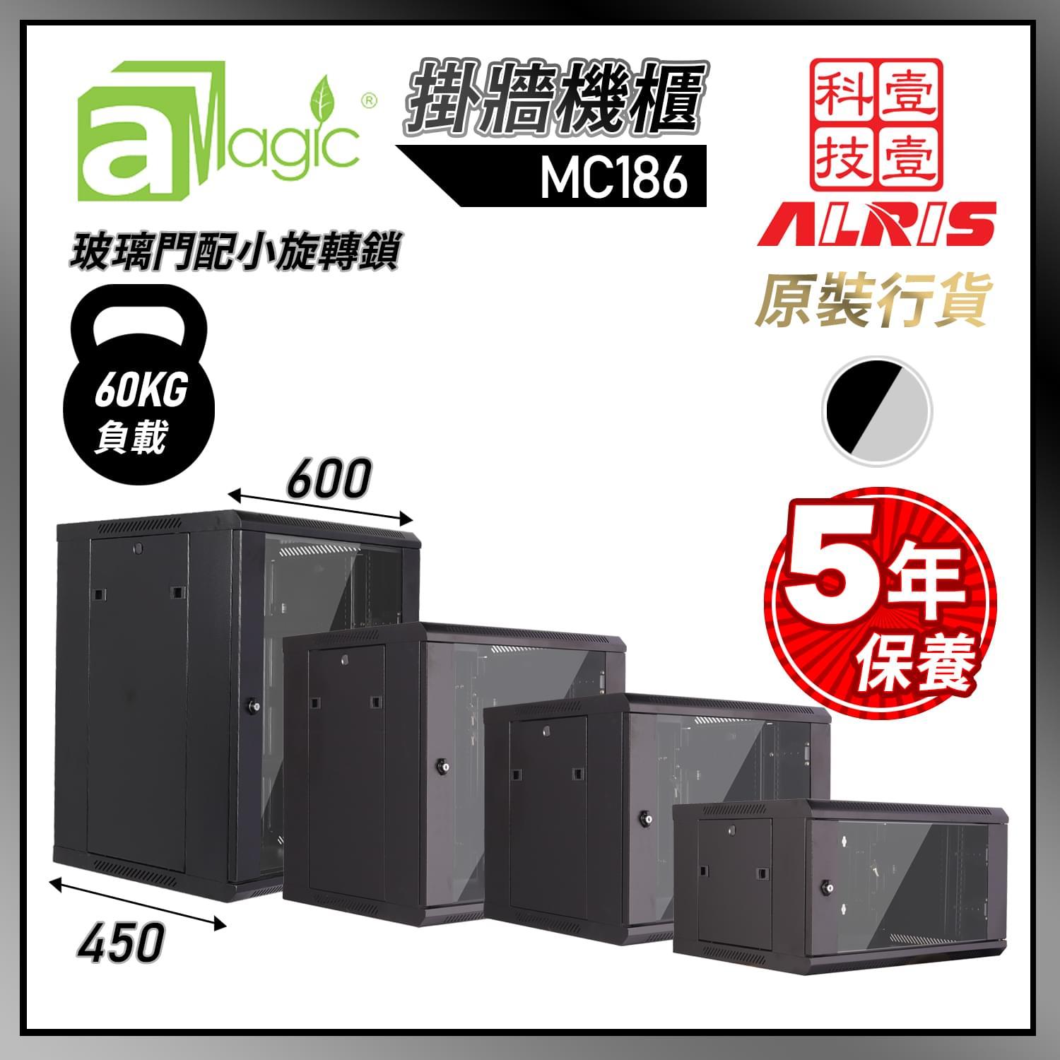 MC186 挂牆機櫃:60kg負載,前鋼化玻璃門配免匙小旋轉鎖,後密封ANSC冷軋鋼板掛牆,鋼板厚度約1.0mm~1.8mm。