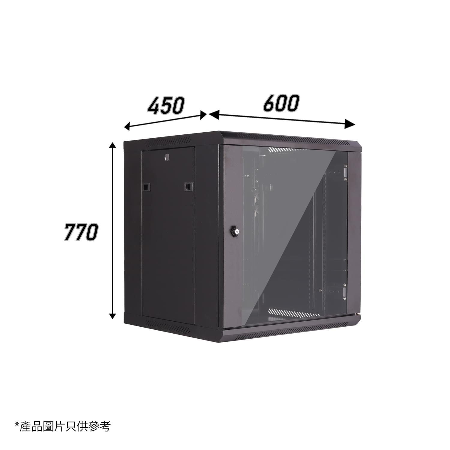 MC186 挂牆機櫃:60kg負載,前鋼化玻璃門配免匙小旋轉鎖,後密封ANSC冷軋鋼板掛牆,鋼板厚度約1.0mm~1.8mm。