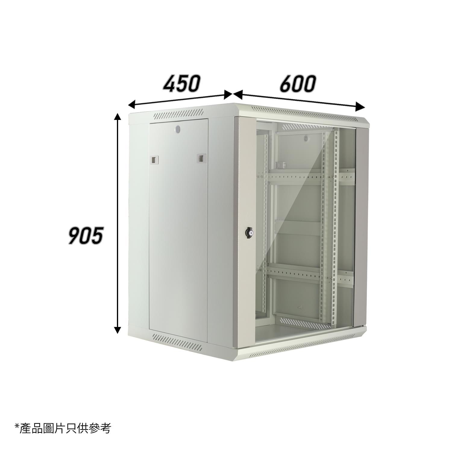 灰色18U掛牆網絡機櫃W600 X D450 X H905mm 0-Fixed Shelf 0-Fan 20-Screw 19inch標準內籠(MC186-6418G)