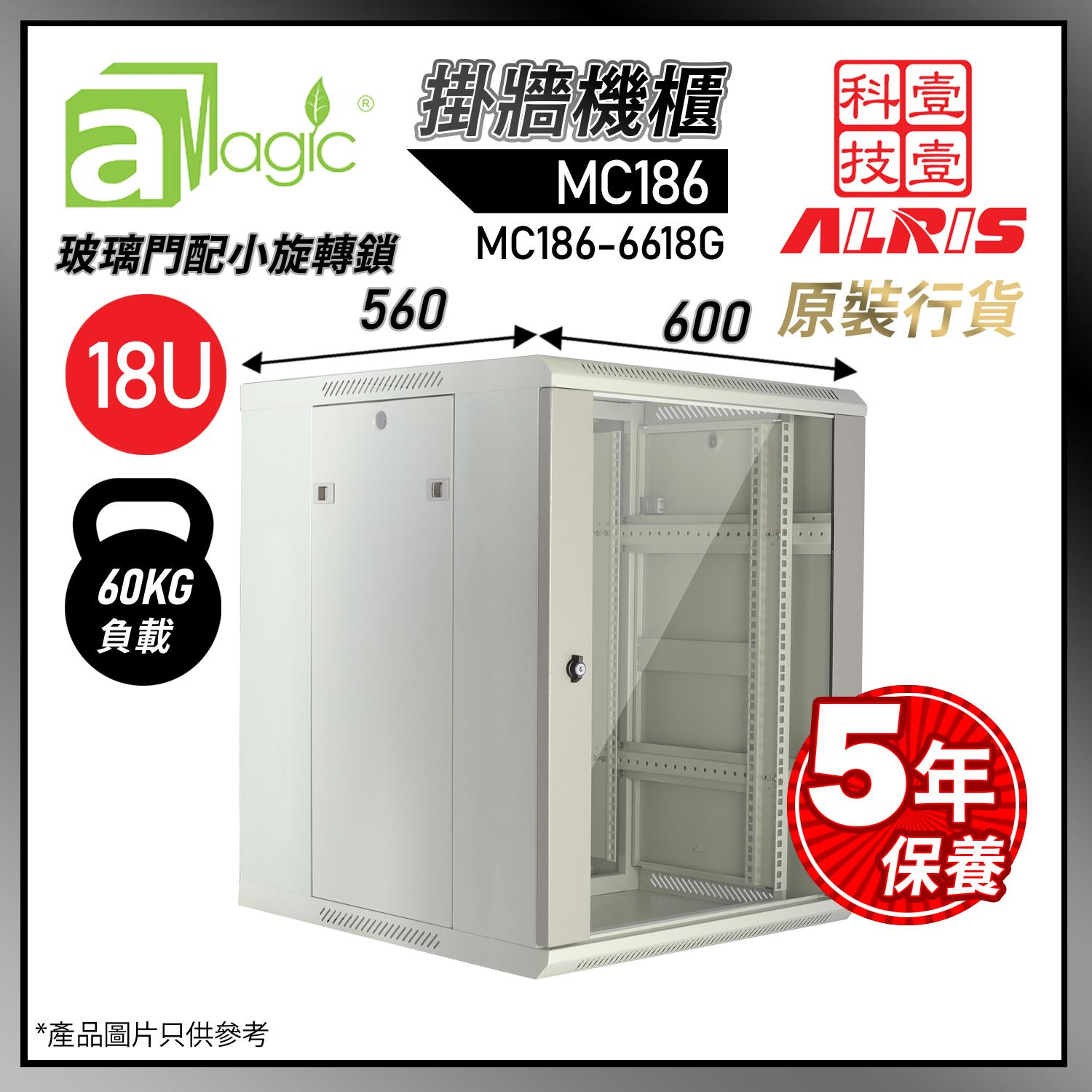 MC186 挂牆機櫃:60kg負載,前鋼化玻璃門配免匙小旋轉鎖,後密封ANSC冷軋鋼板掛牆,鋼板厚度約1.0mm~1.8mm。