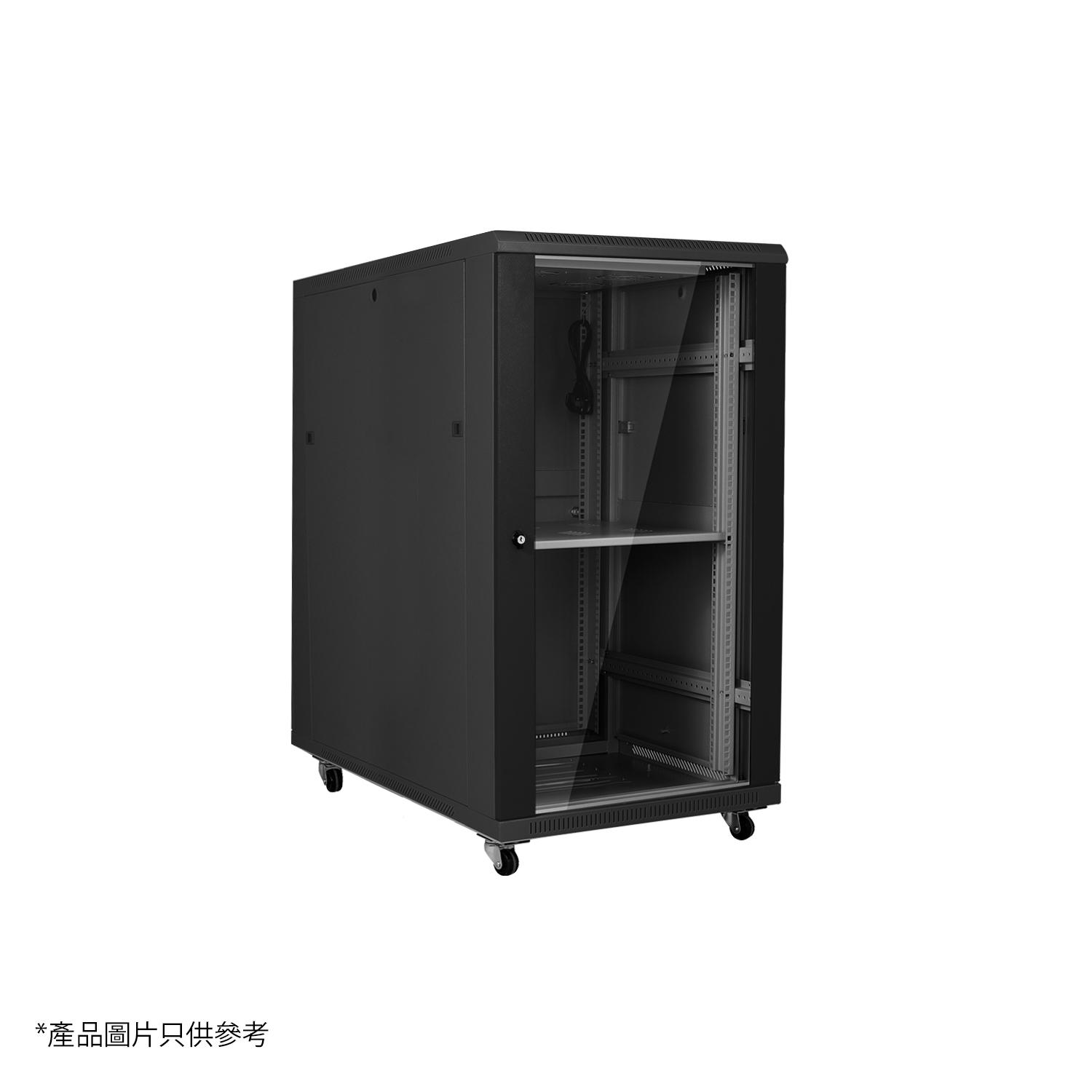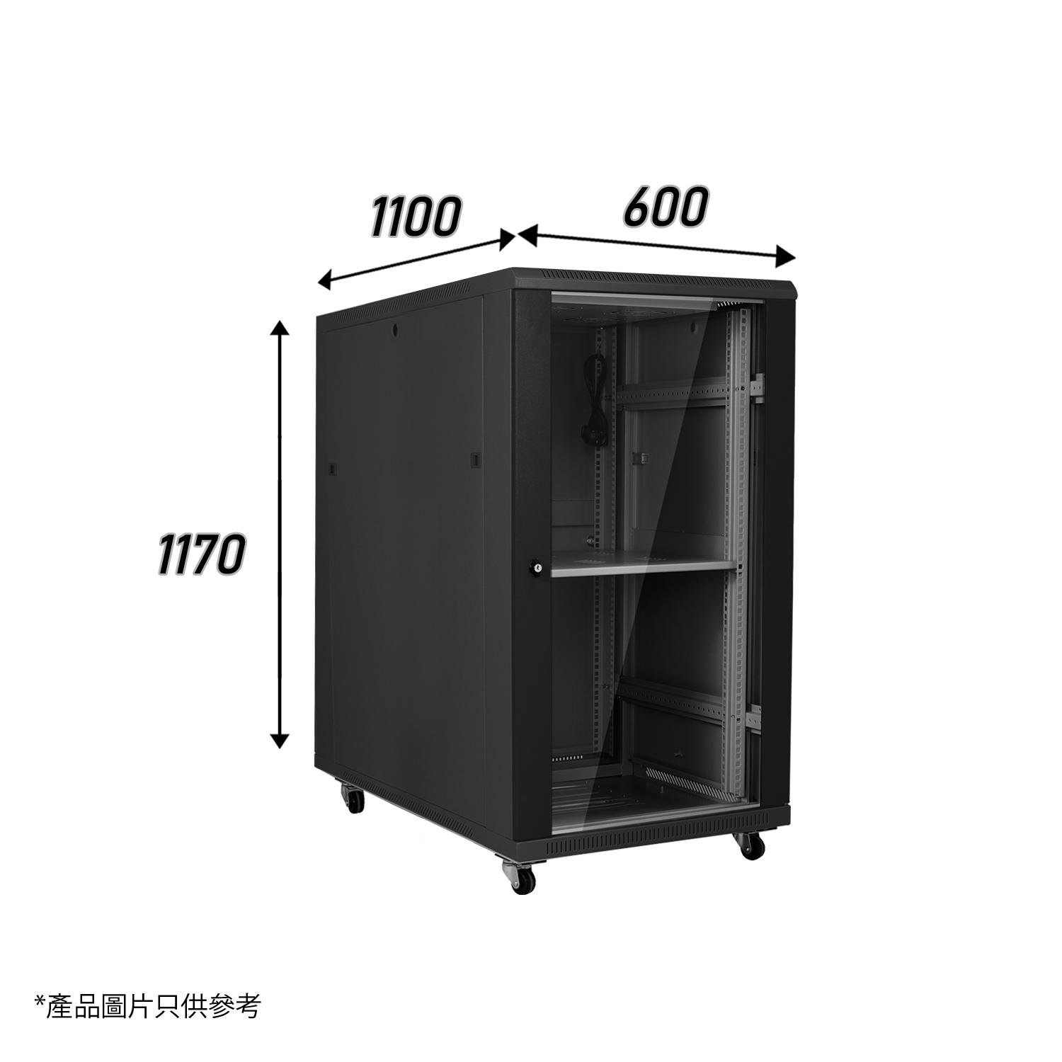 黑色22U標準網絡機櫃W600 X D1100 X H1170mm 1-Fixed Shelf 4-Fan 30-Screw 486mm(MC286-61122B)