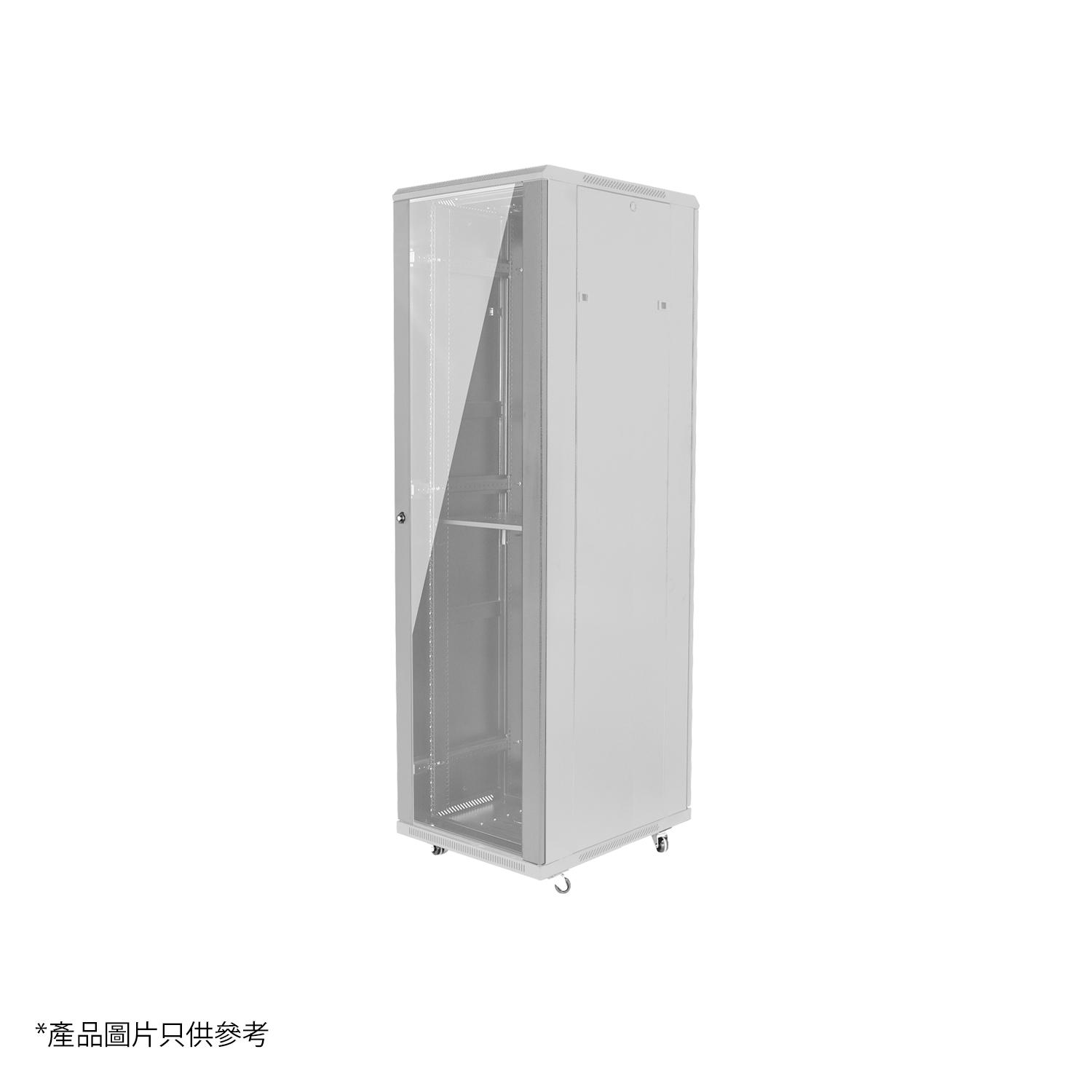MC386 專業機櫃:600kg負載,前弧邊網孔框鋼化玻璃門配免匙大把手鎖,後標準鋼門配免匙小旋轉鎖,L形立柱厚 2.0mm。