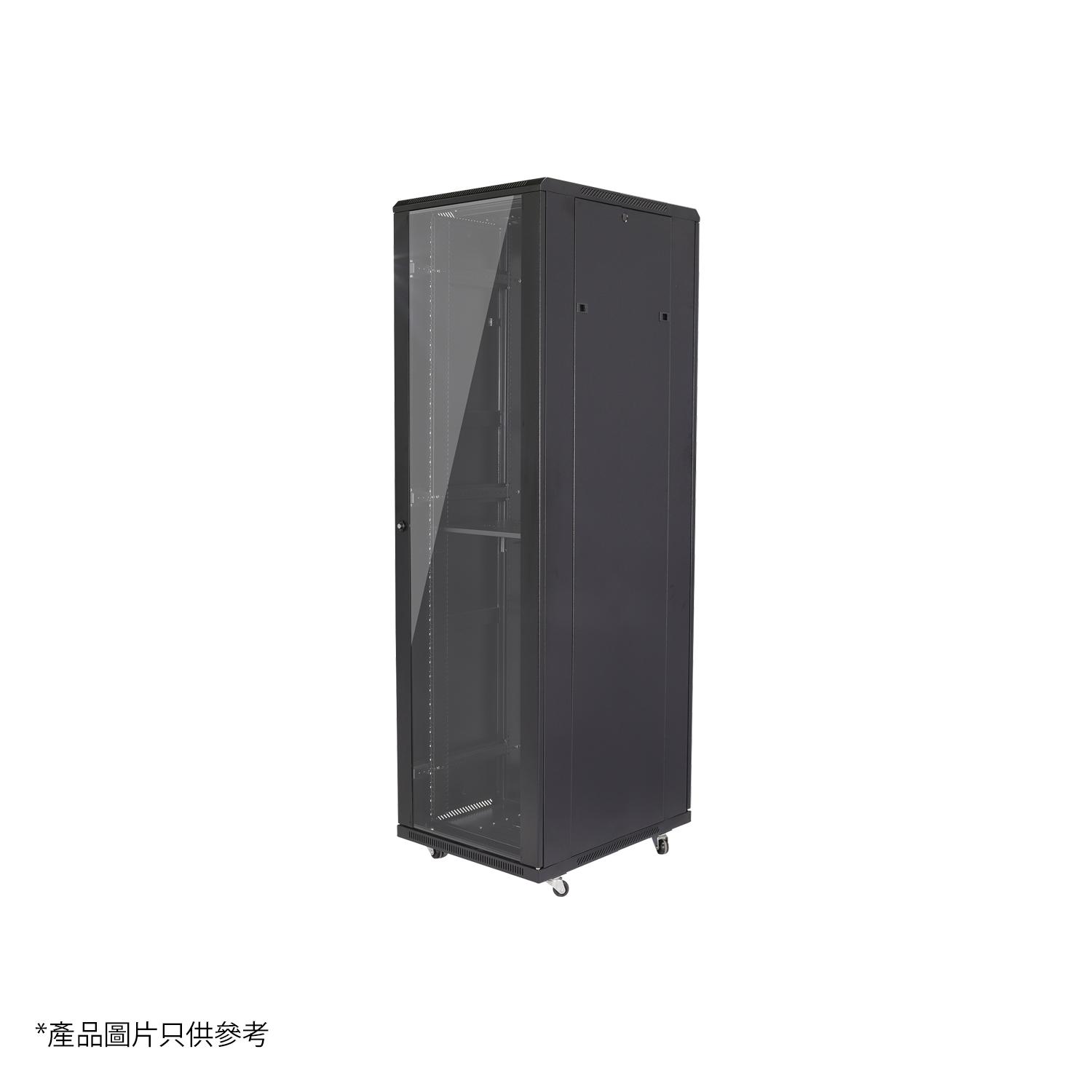 MC386 專業機櫃:600kg負載,前弧邊網孔框鋼化玻璃門配免匙大把手鎖,後標準鋼門配免匙小旋轉鎖,L形立柱厚 2.0mm。