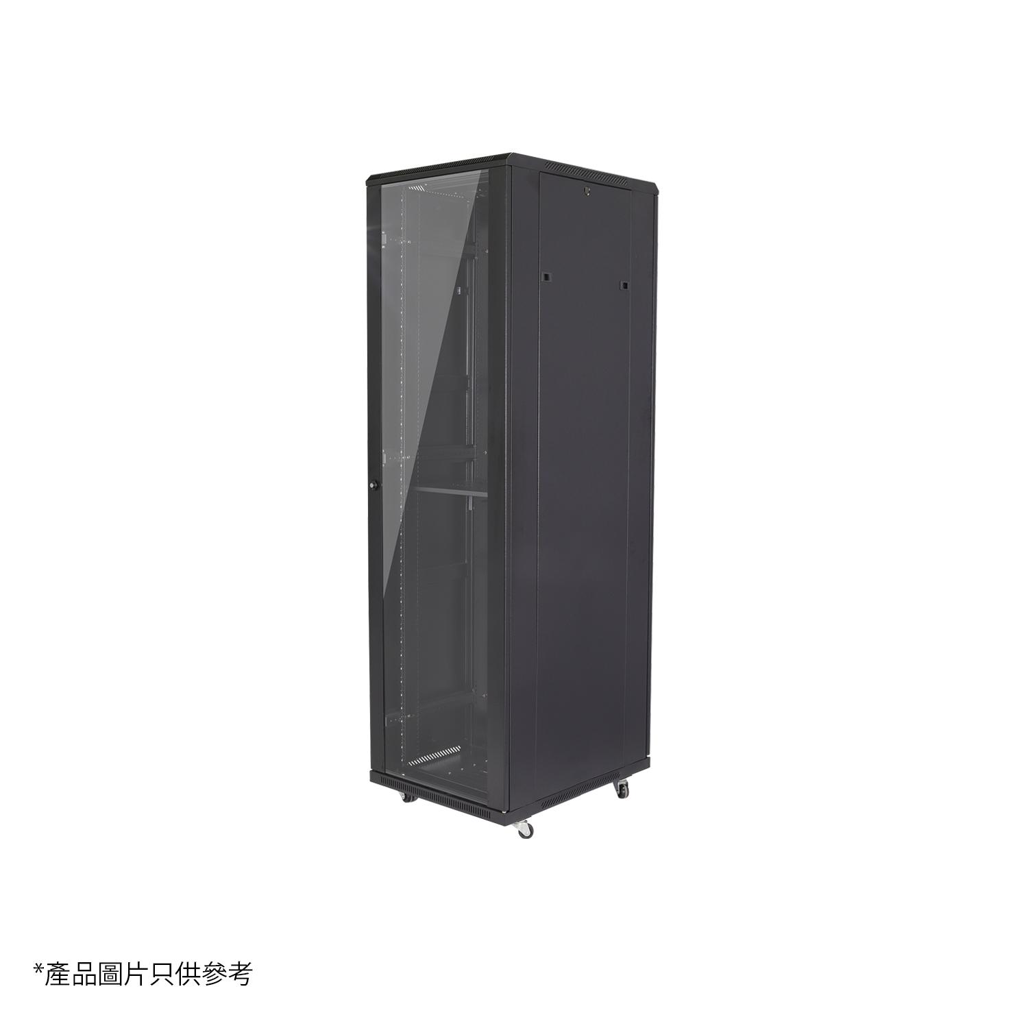 MC386 專業機櫃:600kg負載,前弧邊網孔框鋼化玻璃門配免匙大把手鎖,後標準鋼門配免匙小旋轉鎖,L形立柱厚 2.0mm。
