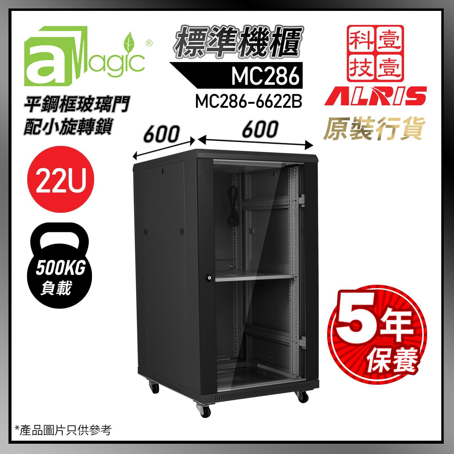 MC286 標準機櫃:500kg負載,前平鋼框鋼化玻璃門配免匙小旋轉鎖,後標準鋼門配免匙小旋轉鎖,L形立柱厚 2.0mm。