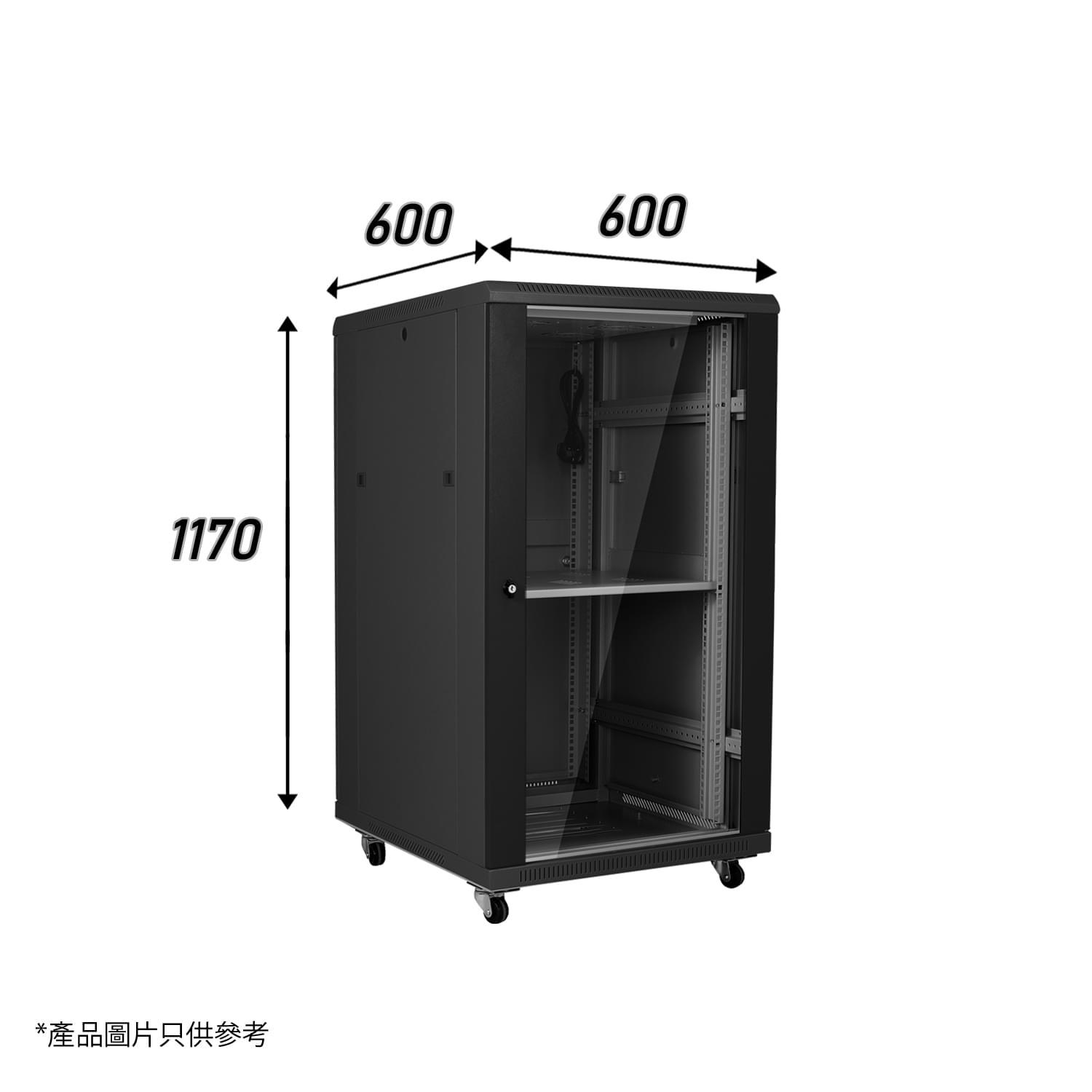 黑色22U標準網絡機櫃W600 X D600 X H1170mm 1-Fixed Shelf 2-Fan 30-Screw 486mm(MC286-6622B)