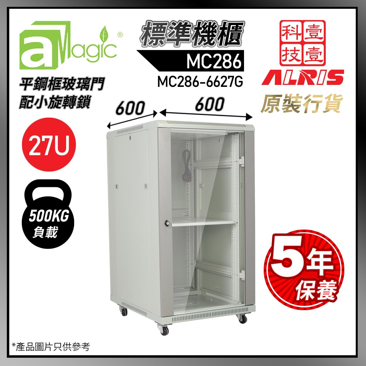 MC286 標準機櫃:500kg負載,前平鋼框鋼化玻璃門配免匙小旋轉鎖,後標準鋼門配免匙小旋轉鎖,L形立柱厚 2.0mm。