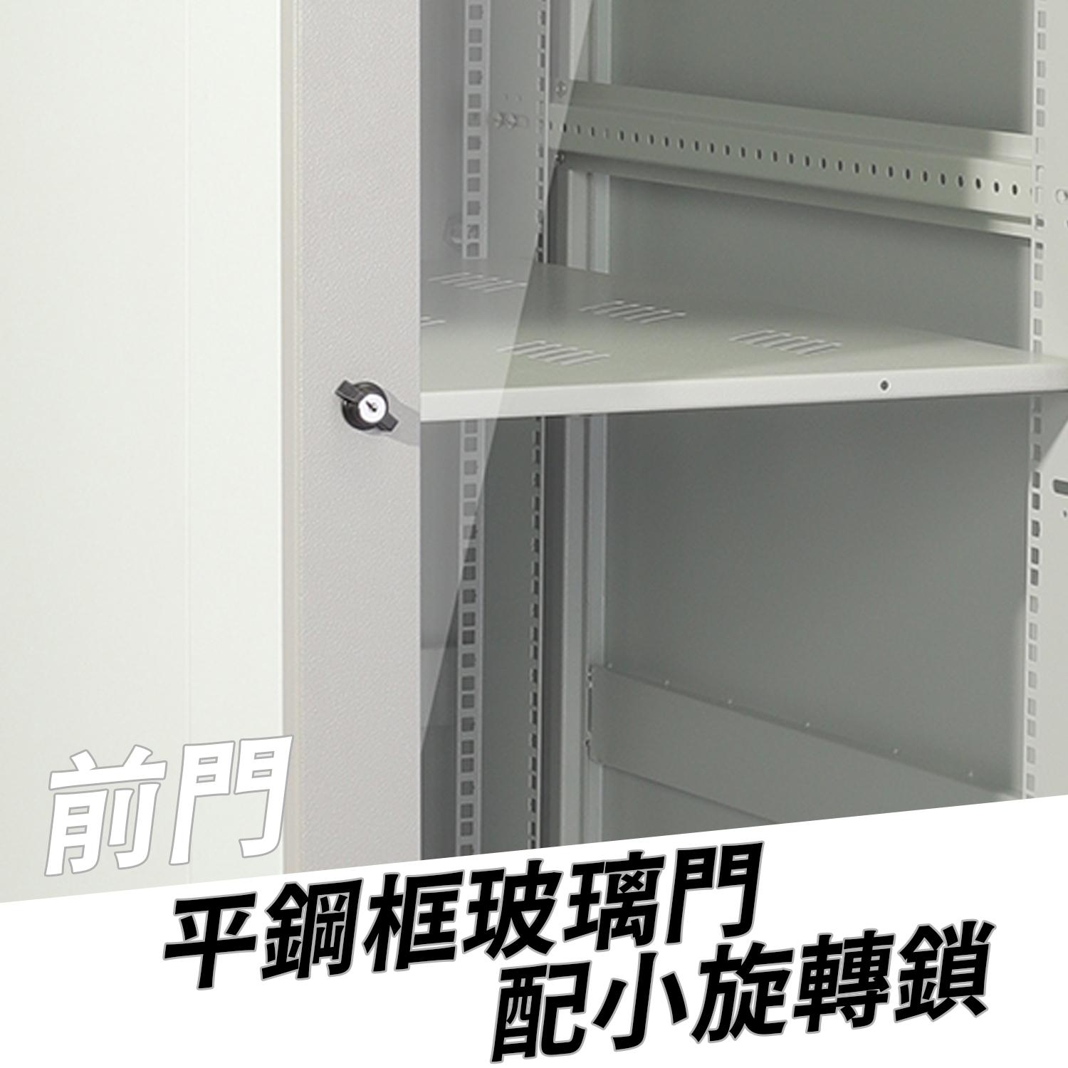 MC286 標準機櫃:500kg負載,前平鋼框鋼化玻璃門配免匙小旋轉鎖,後標準鋼門配免匙小旋轉鎖,L形立柱厚 2.0mm。