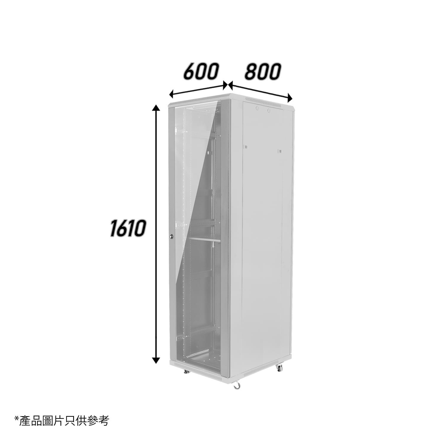灰色32U標準網絡機櫃W600 X D800 X H1610mm 1-Fixed Shelf 4-Fan 50-Screw 486mm(MC286-6832G)