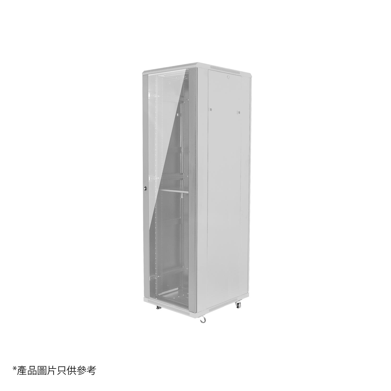 MC386 專業機櫃:600kg負載,前弧邊網孔框鋼化玻璃門配免匙大把手鎖,後標準鋼門配免匙小旋轉鎖,L形立柱厚 2.0mm。