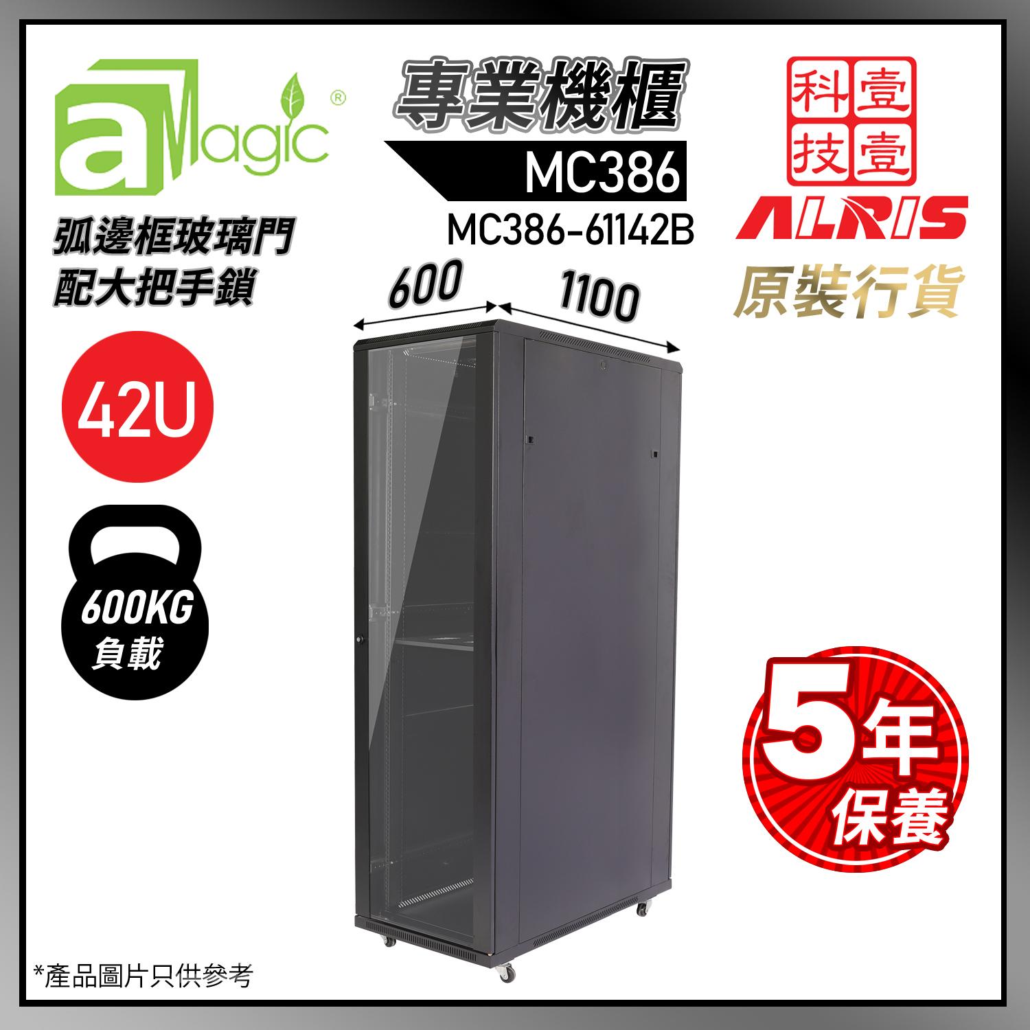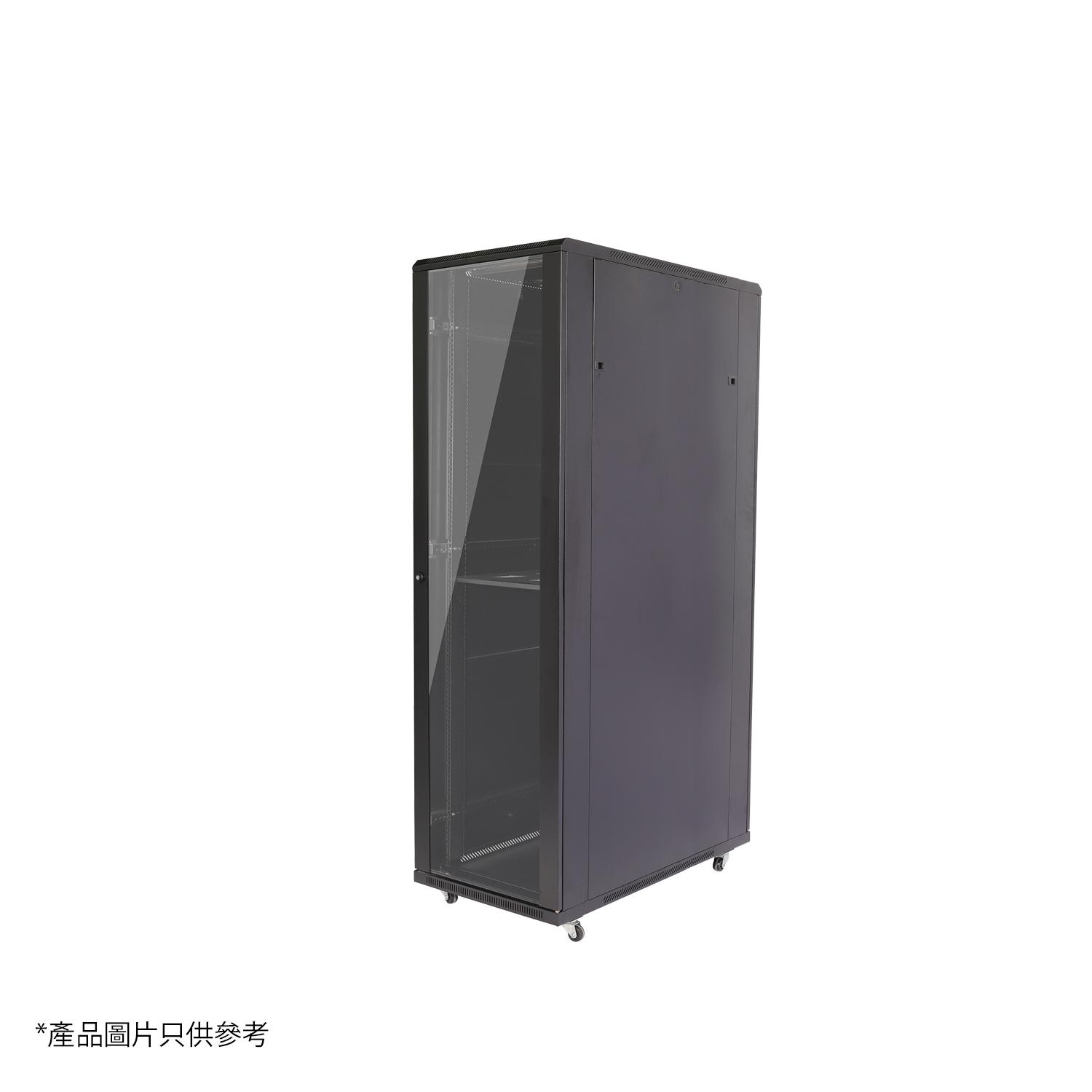 MC386 專業機櫃:600kg負載,前弧邊網孔框鋼化玻璃門配免匙大把手鎖,後標準鋼門配免匙小旋轉鎖,L形立柱厚 2.0mm。