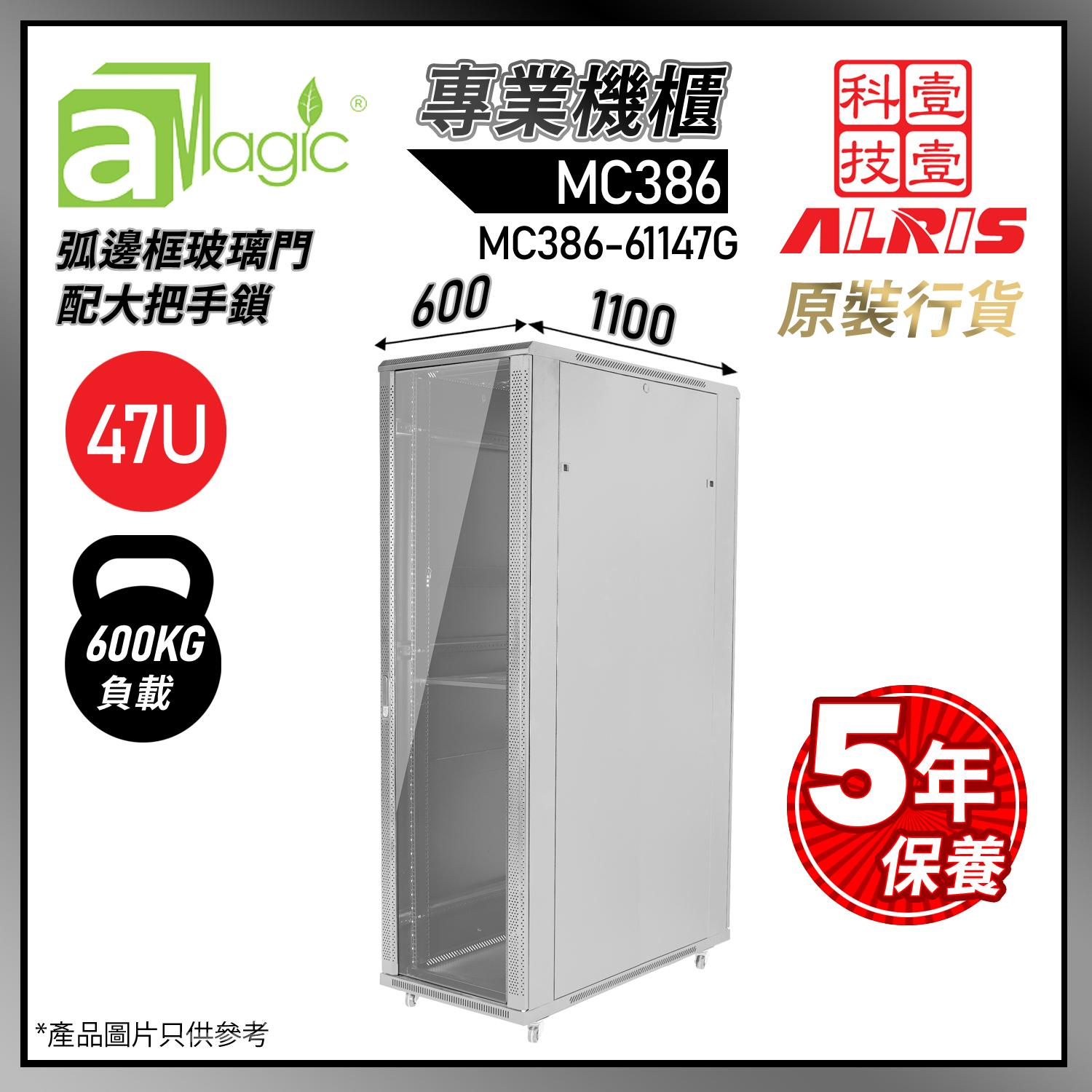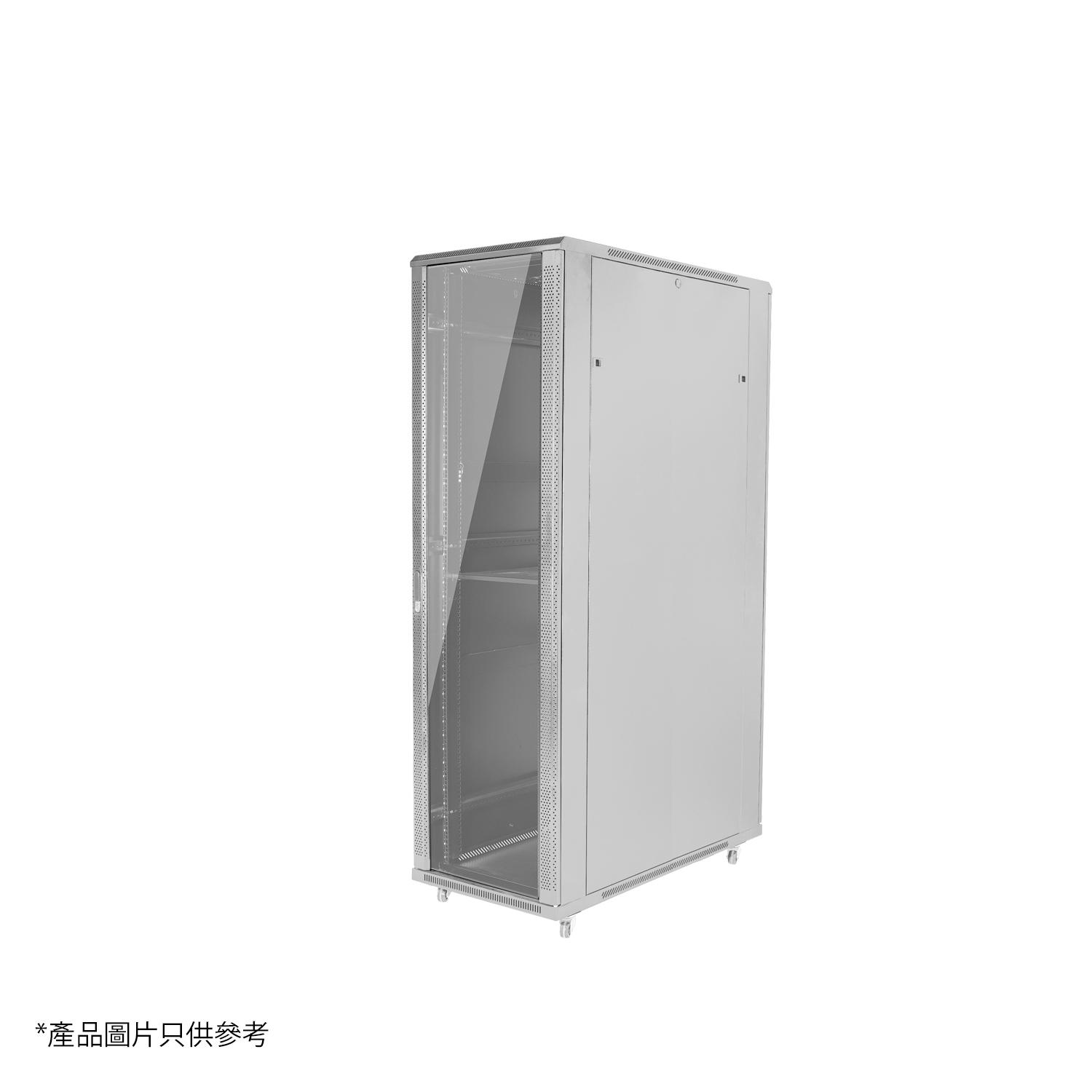 MC386 專業機櫃:600kg負載,前弧邊網孔框鋼化玻璃門配免匙大把手鎖,後標準鋼門配免匙小旋轉鎖,L形立柱厚 2.0mm。