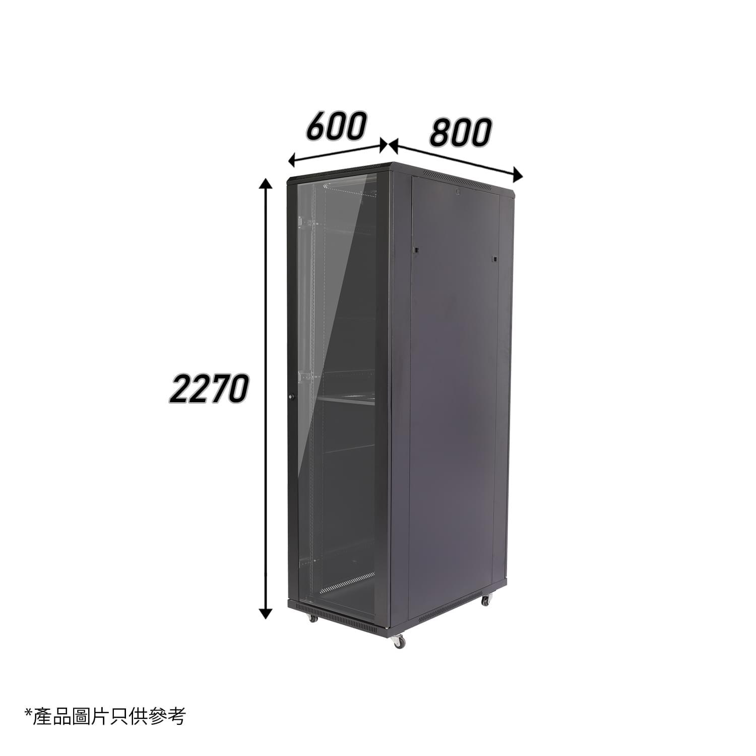 MC386 專業機櫃:600kg負載,前弧邊網孔框鋼化玻璃門配免匙大把手鎖,後標準鋼門配免匙小旋轉鎖,L形立柱厚 2.0mm。