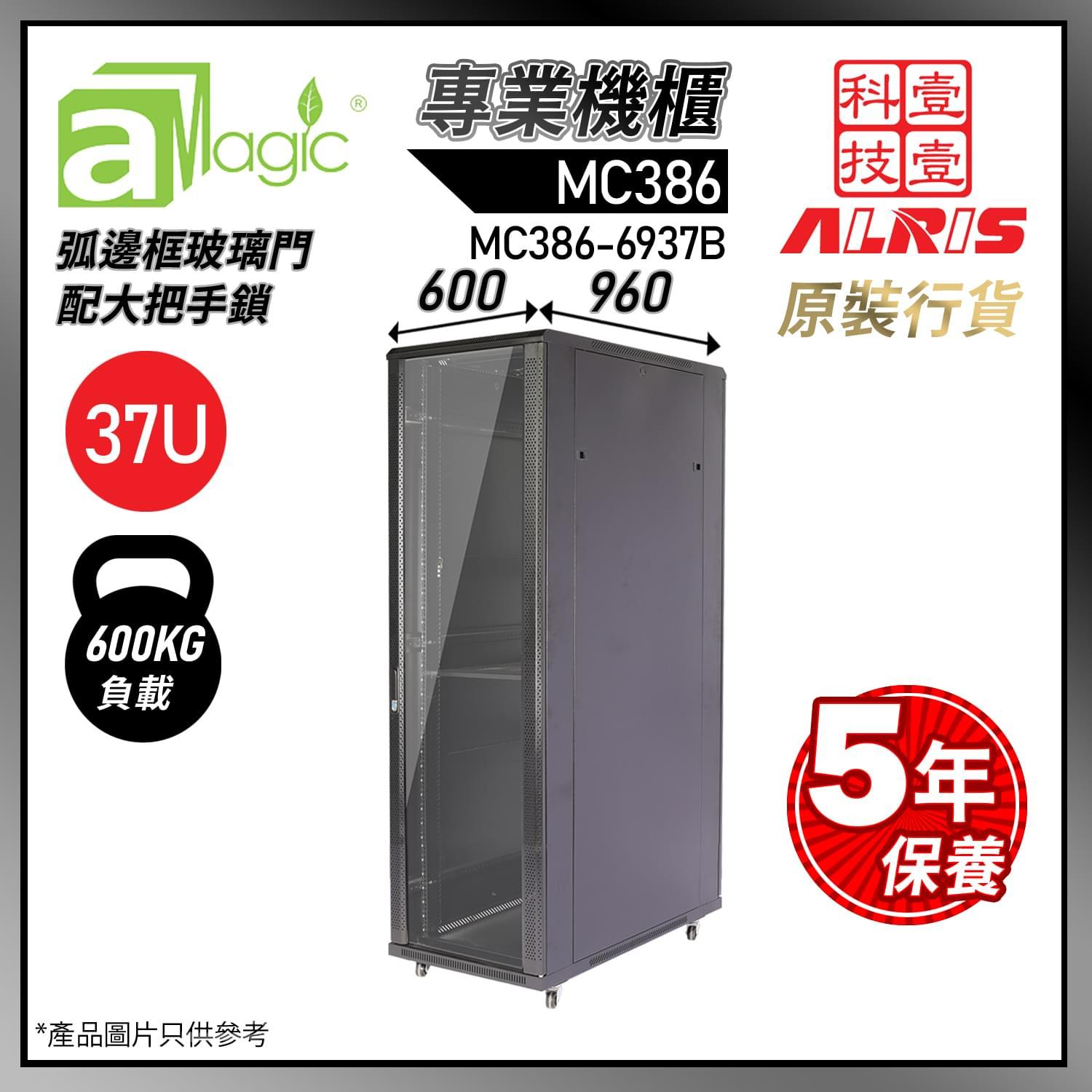 MC386 專業機櫃:600kg負載,前弧邊網孔框鋼化玻璃門配免匙大把手鎖,後標準鋼門配免匙小旋轉鎖,L形立柱厚 2.0mm。