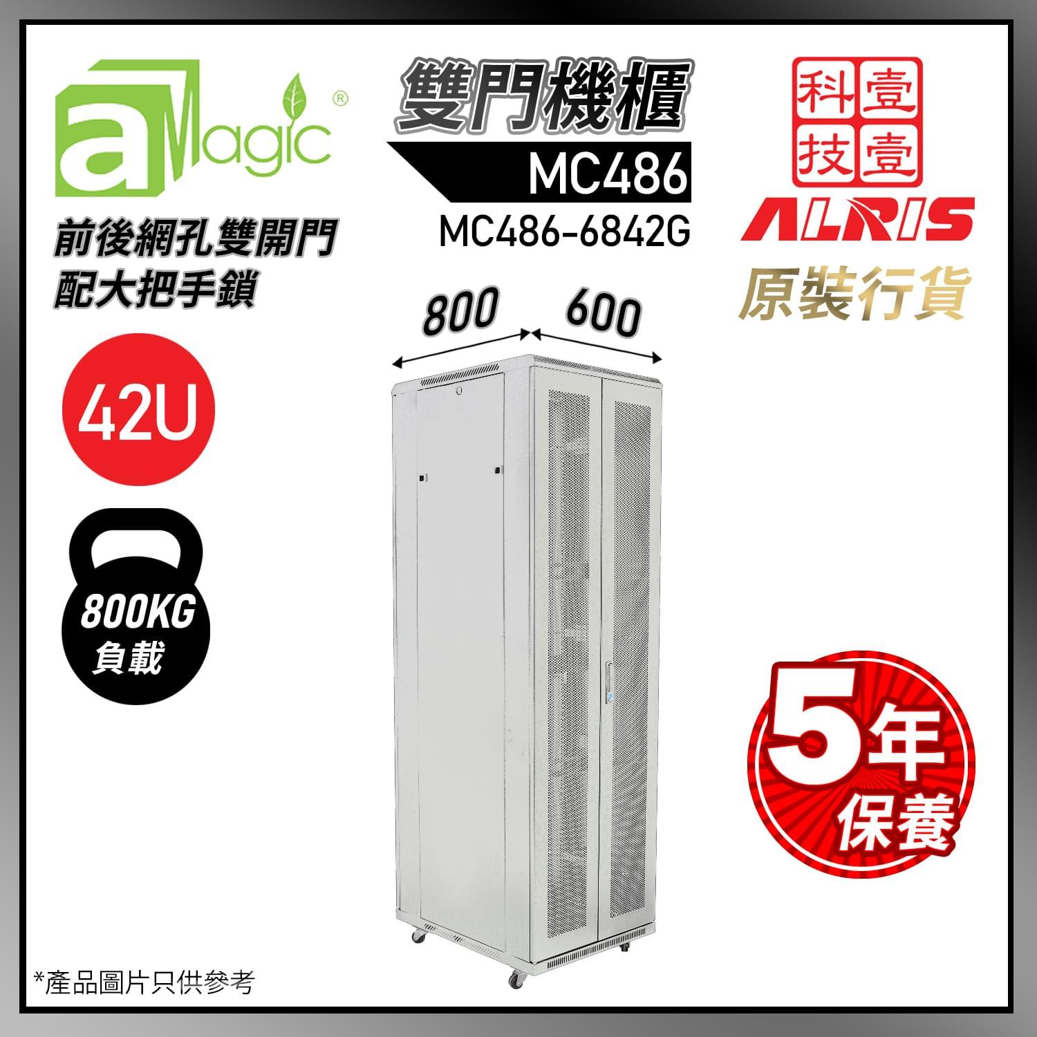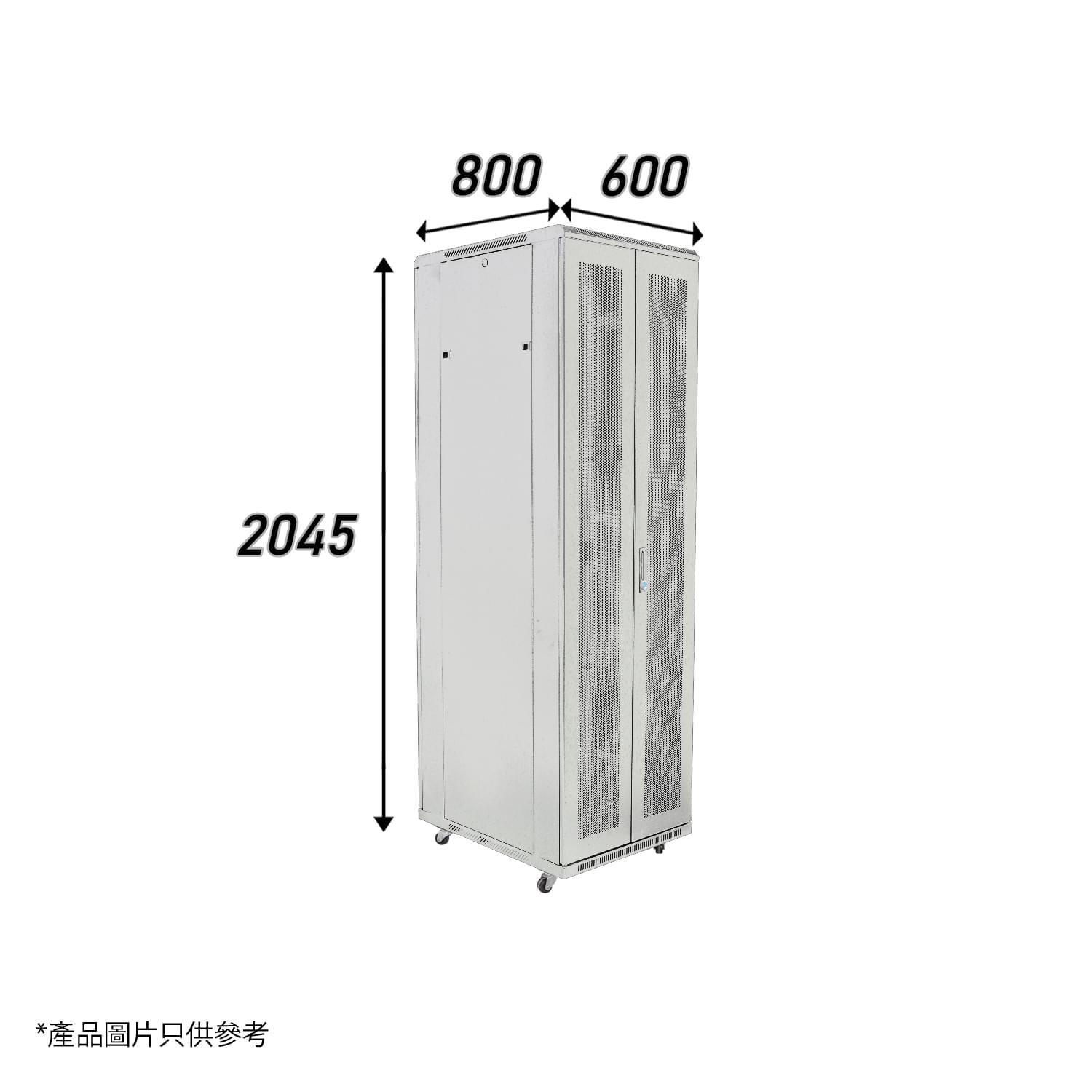 灰色42U雙開網門網絡機櫃W600 X D800 X H2045mm 1-Fixed Shelf 4-Fan 50-Screw 486mm特寬內籠(MC486-6842G)