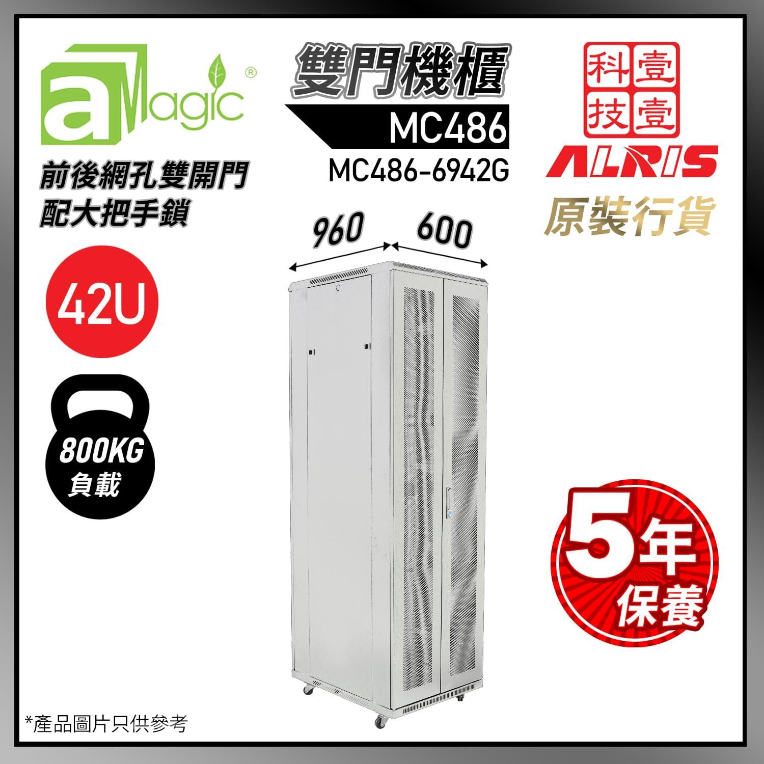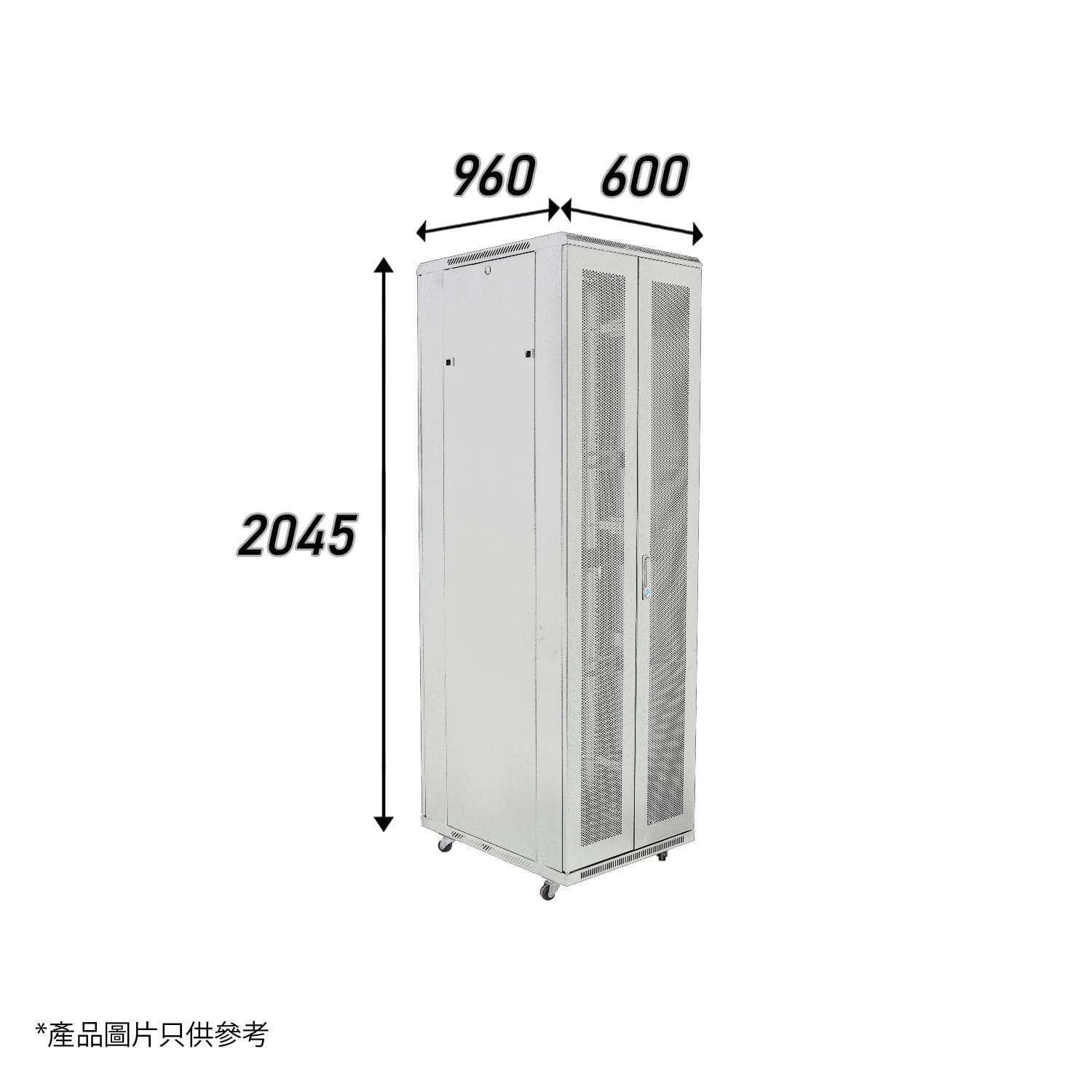 灰色42U雙開網門網絡機櫃W600 X D960 X H2045mm 1-Fixed Shelf 4-Fan 50-Screw 486mm特寬內籠(MC486-6942G)