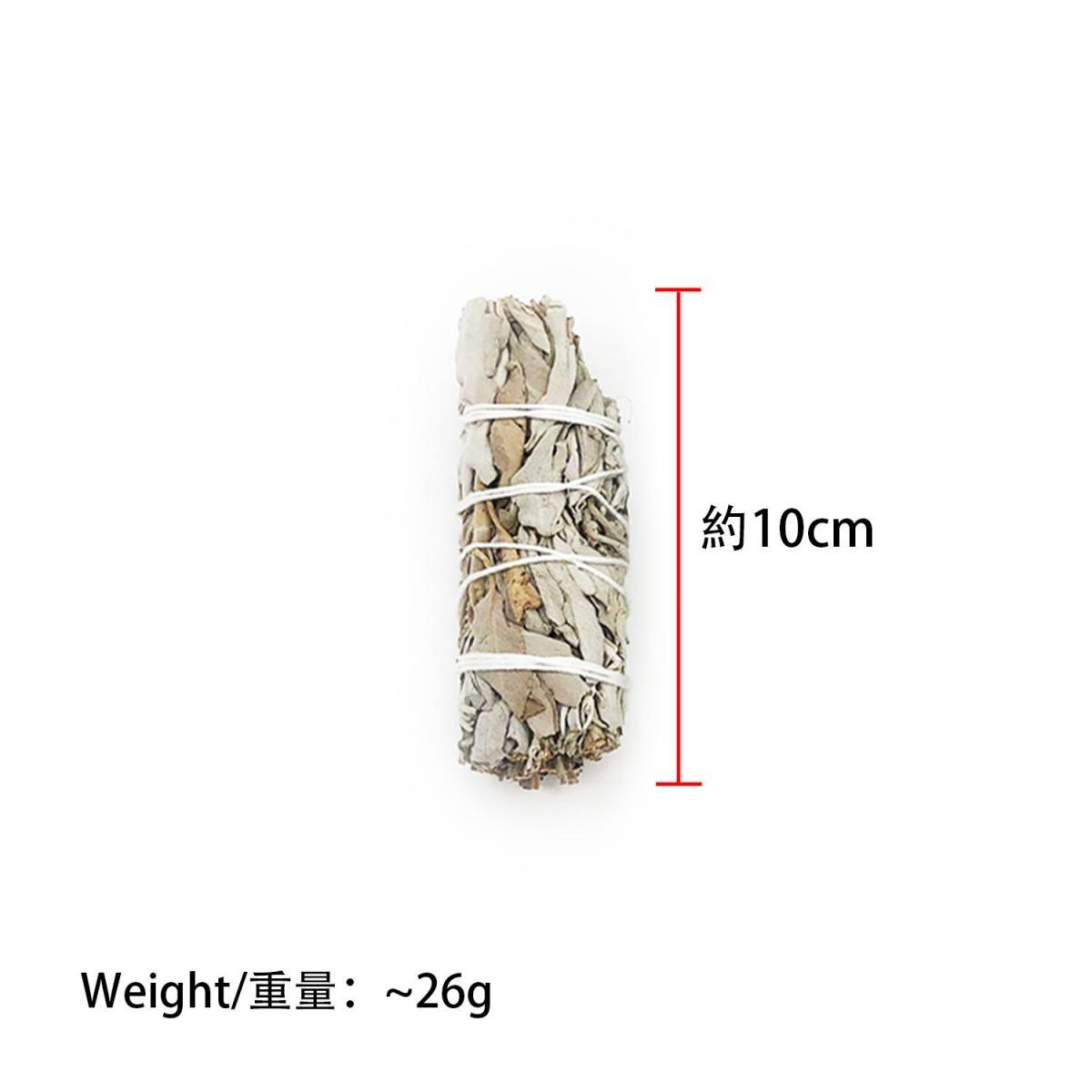 10CM美國加州純白鼠尾草(White Sage)約26克 型號:PURE-WHITE-SAGE-10CM 產地:美國加州 長度:約10CM 重量:約26g 燃燒白鼠尾草的適用時機及對象 個人 :淨化個人氣場,去除負面能量,特別是在冥想靜坐時或靈修前。 物品 :去除物品所帶有的負能量。 空間 :清理環境負能量,淨化及為周遭環境提供保護。 儀式前 : 個人靜心或團體瞑想前淨化所在場域。 淨化七輪 : 在脈輪前方順時針打圈煙薰。 淨化水晶柱 : 在水晶柱尖頭上方順時針打圈煙薰。 心平氣和時 : 靜心冥想後、情緒釋放後、或與人衝突後希望淨化四周環境空間消除負能量。 任何時候當你需要勇氣、鼓勵、冷靜時,燃點白鼠尾草淨化身心,帶給你意想不到的體會。 白色鼠尾草比線香更天然,無任何添加,適合率真、隨性、愛天然、愛自在、愛真個性的你。 *價格只包含一扎鼠尾草,不包含相片中的裝飾品 |