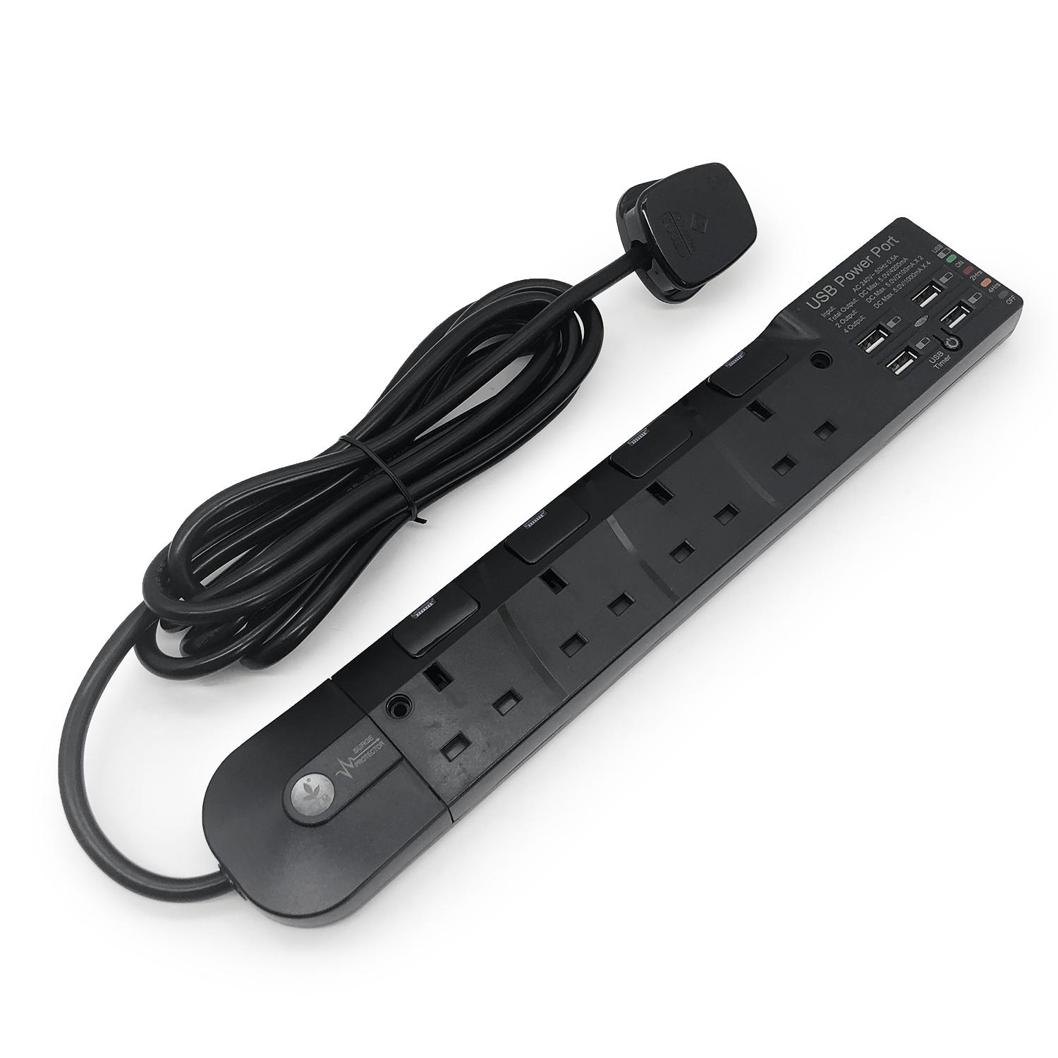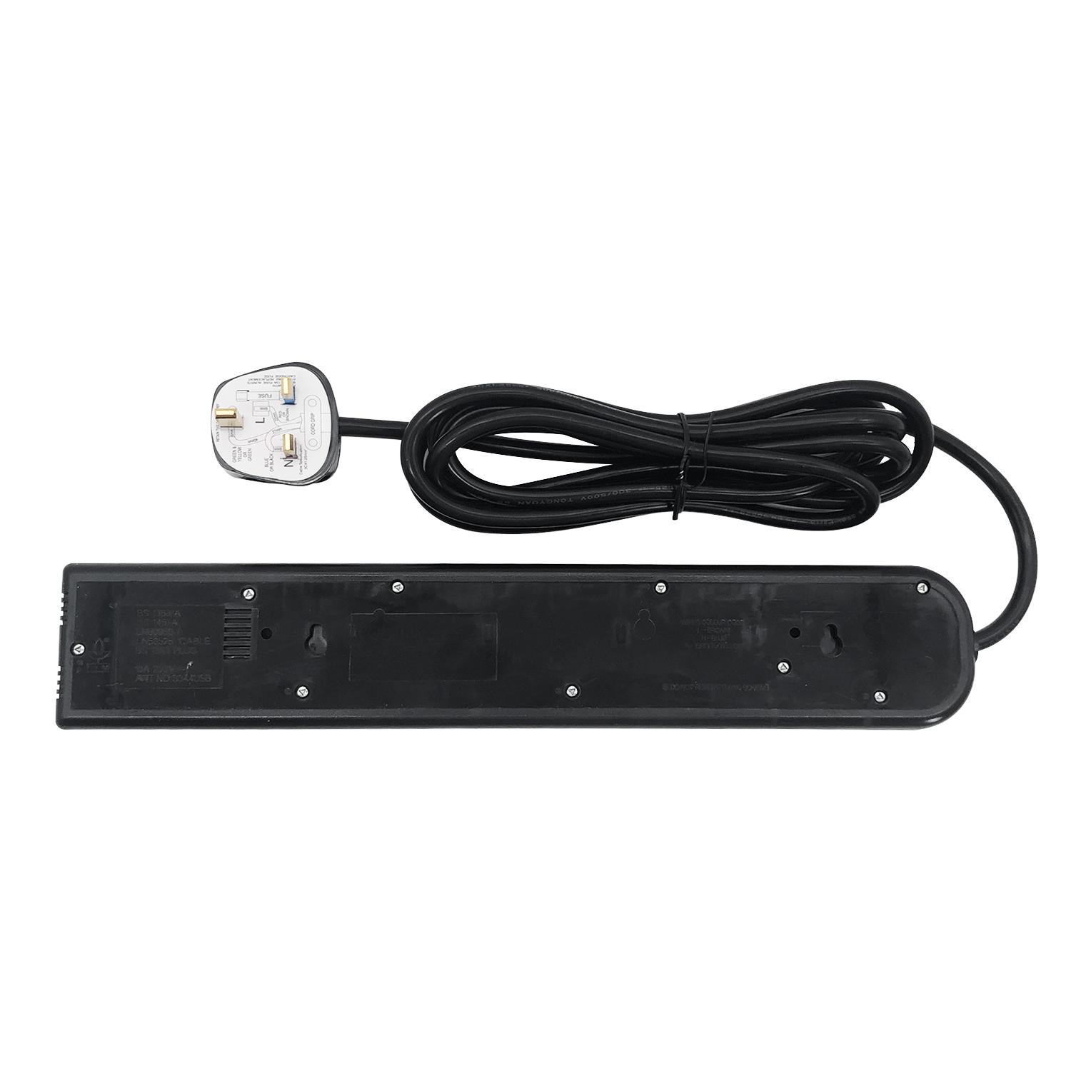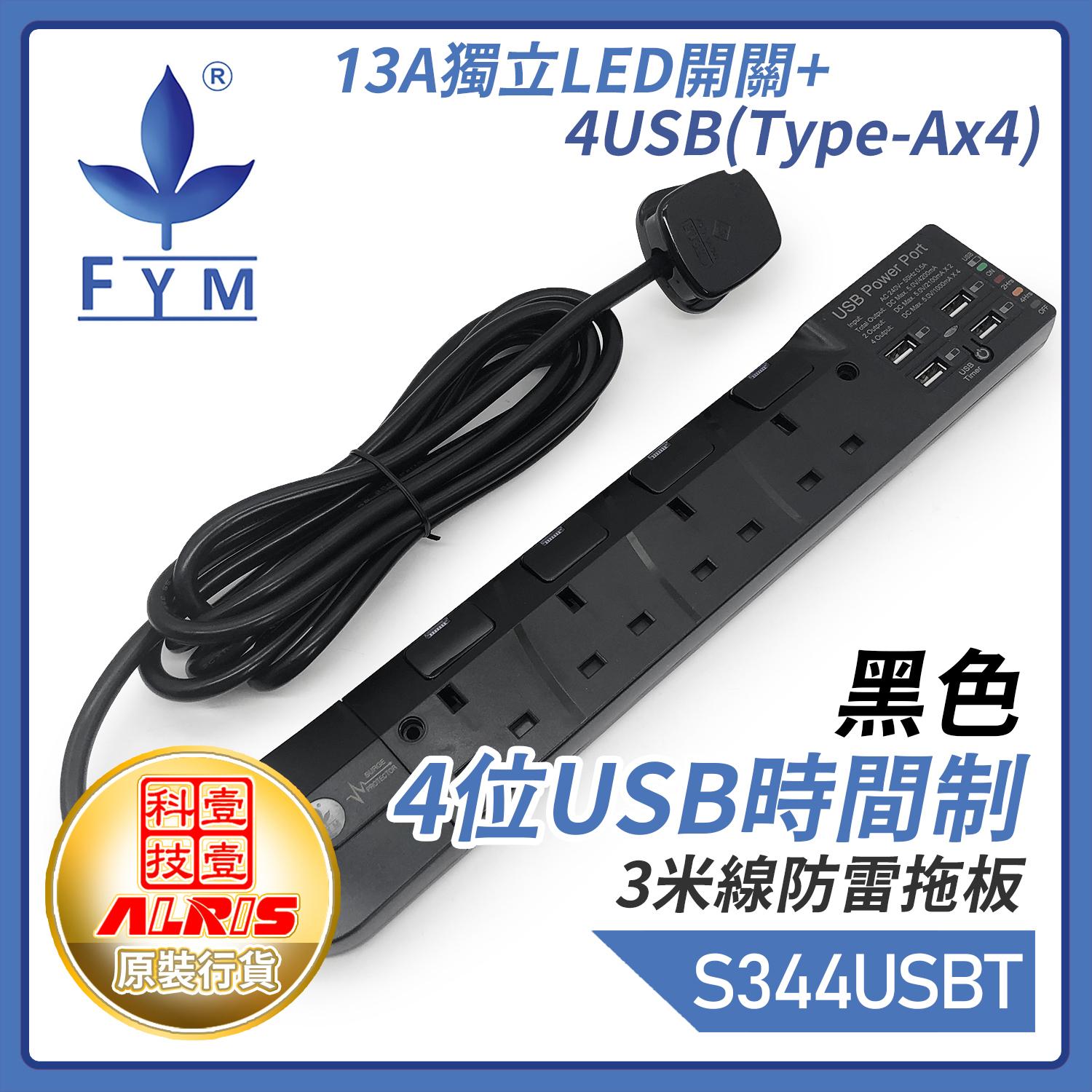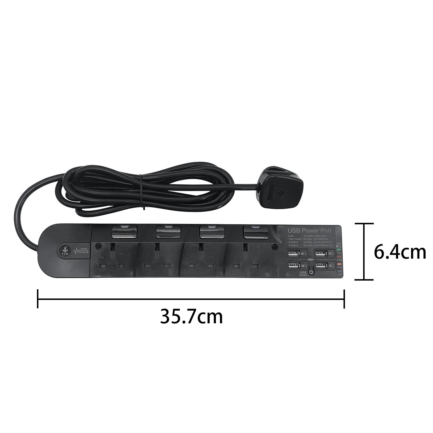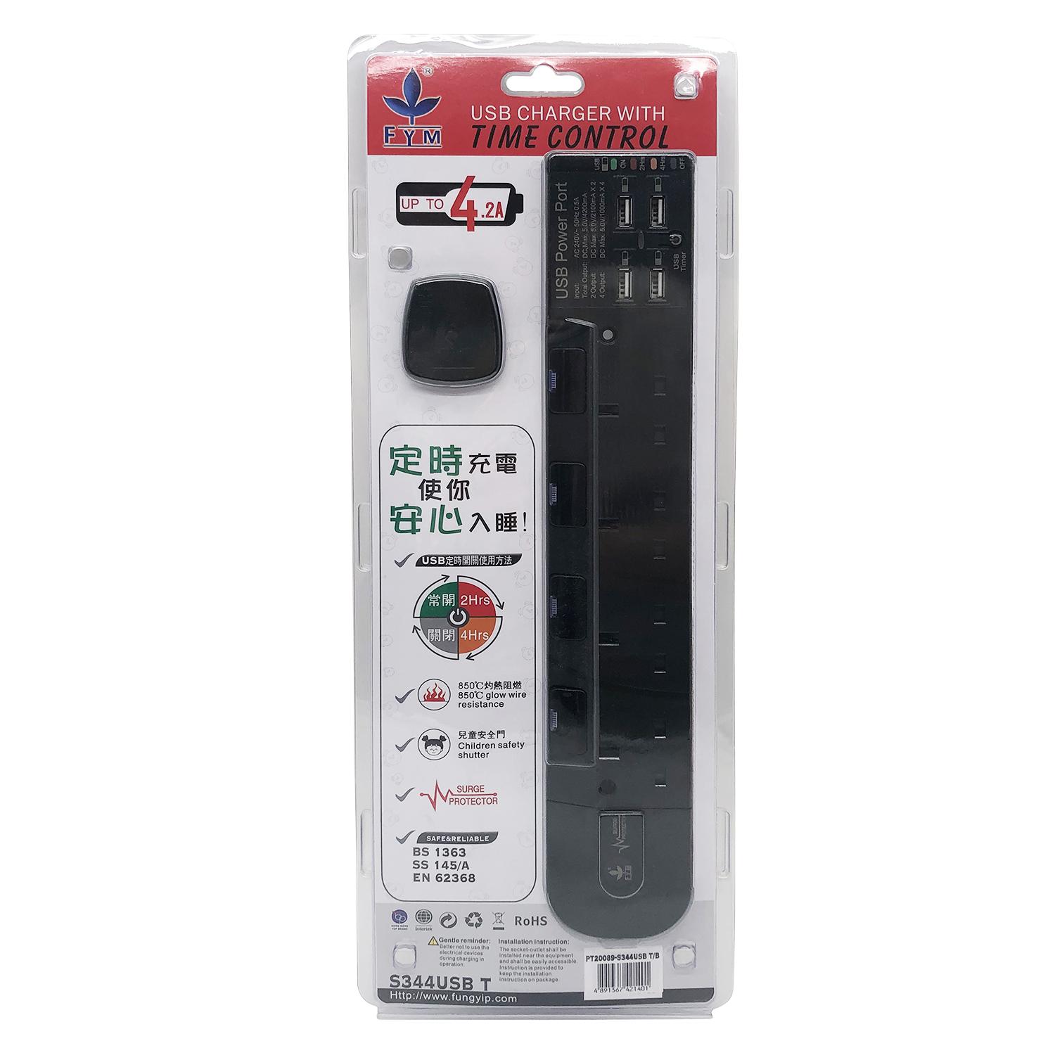 黑色4位13A獨立LED開關+4USB(Type-Ax4)USB時間制3米線防雷拖板