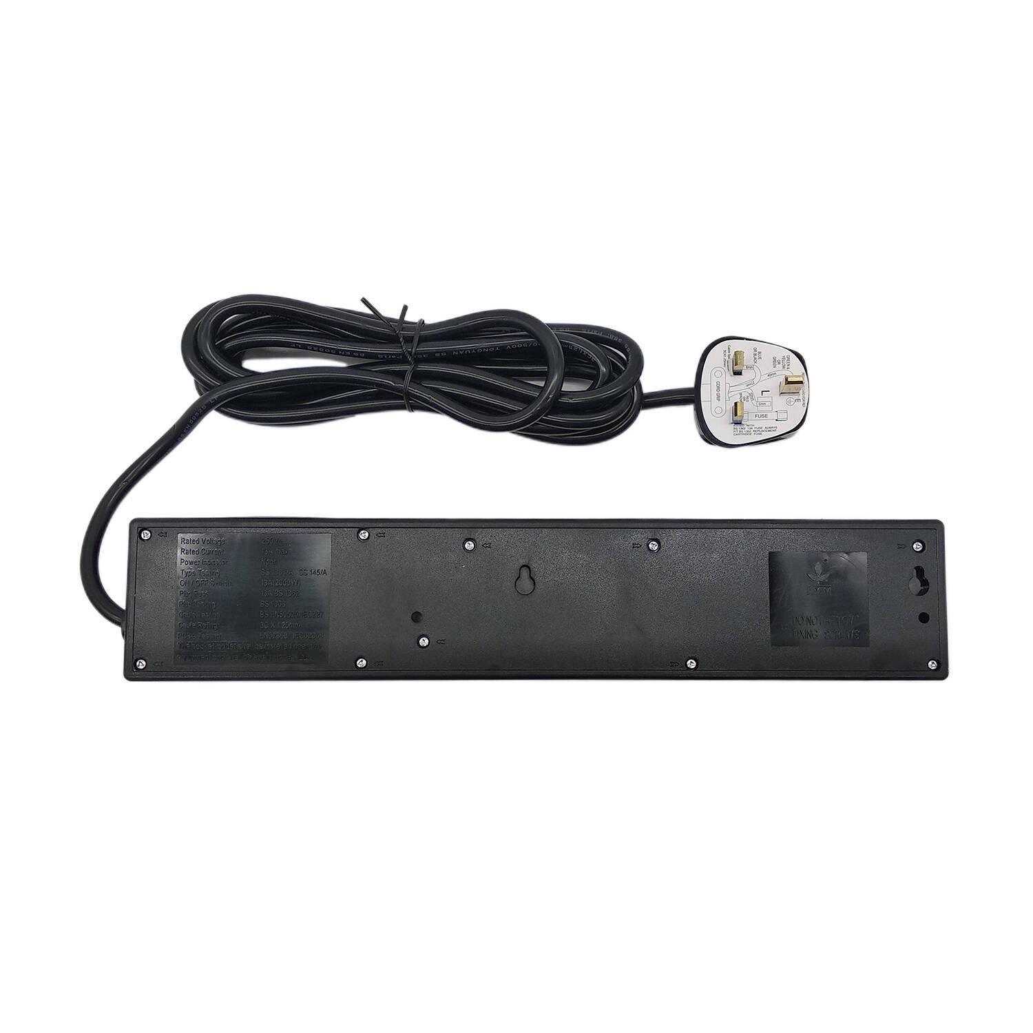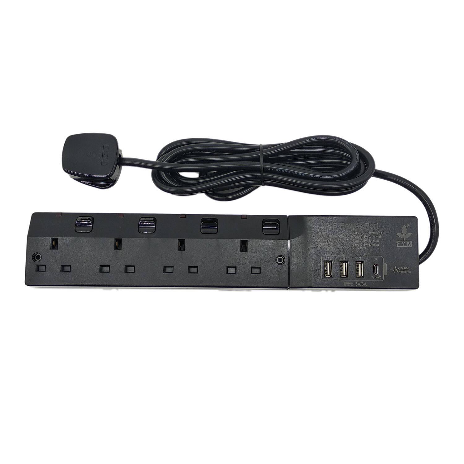 黑色4位13A獨立LED開關+4USB(Type-Ax3+Type-Cx1)3米線防雷拖板