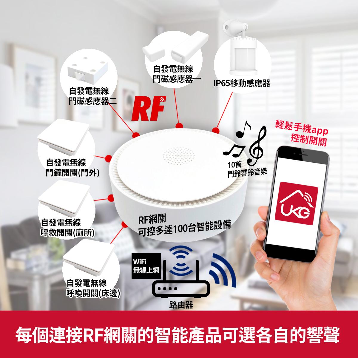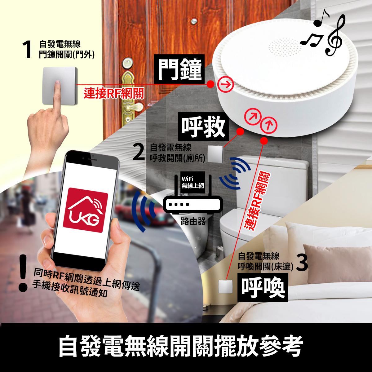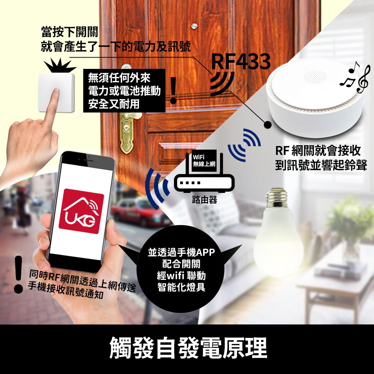 配對動能自發電RF無線開關,即變身智能無線門鐘,不但可以選擇多種響聲,還可以通知移動APP,即使身在遠端,亦收到家中按門鐘的提示。還可以聯動開燈光來提示家中聽覺有問題的人仕。亦可以按不同的無線開關,發出不同的聲音,作為SOS的求救訊號。