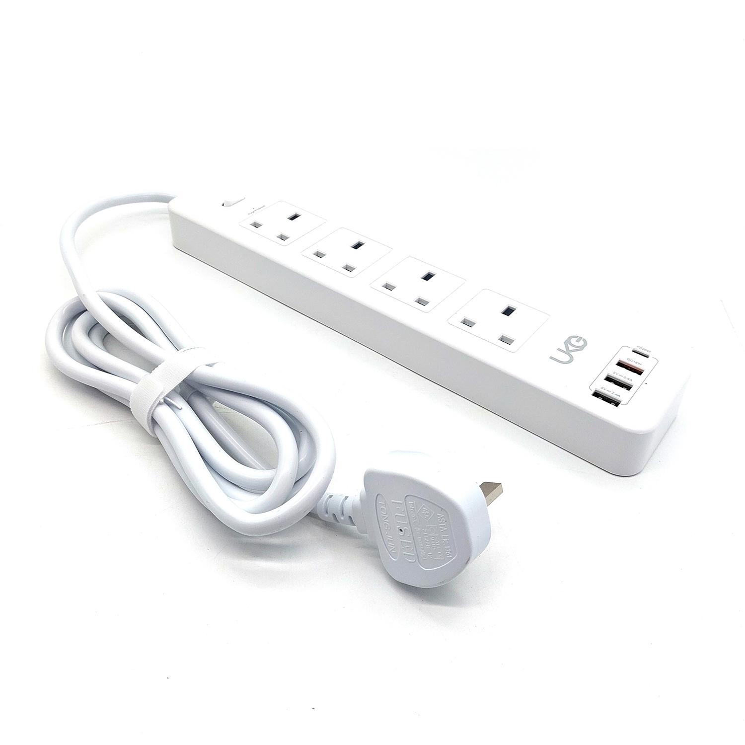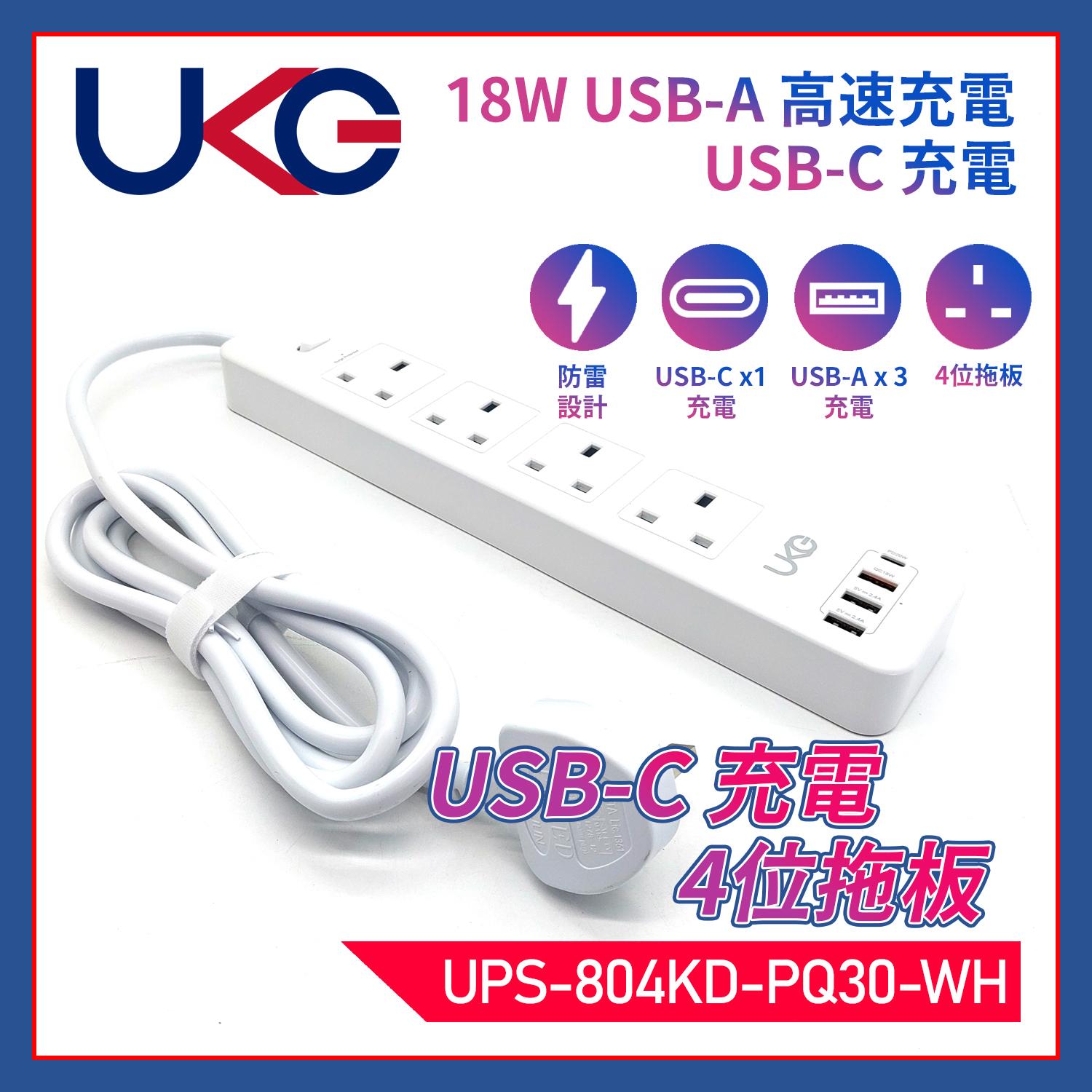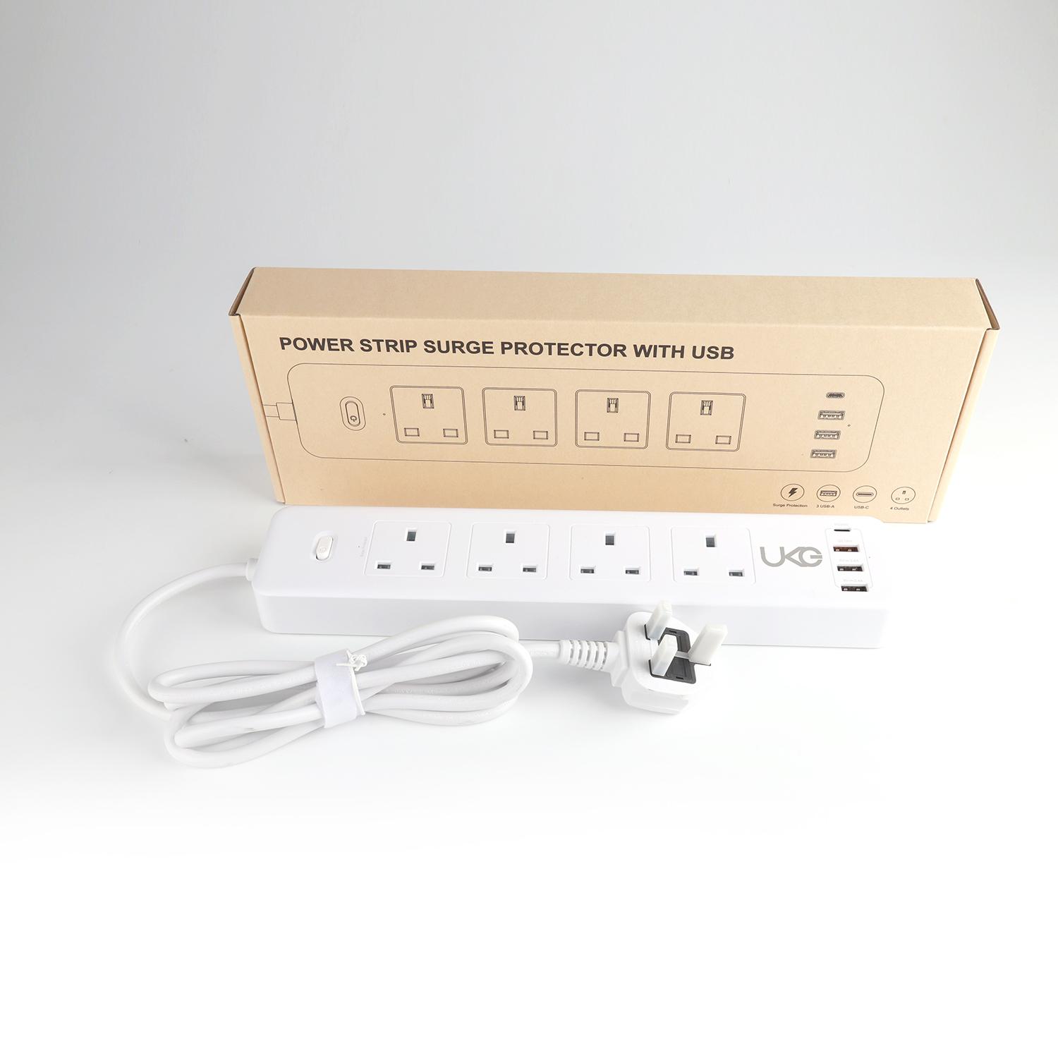 白色4位13A帶總開關+4USB(1xUSB-C PD&QC3.0+3xUSB-A) 2米電線長條形拖板