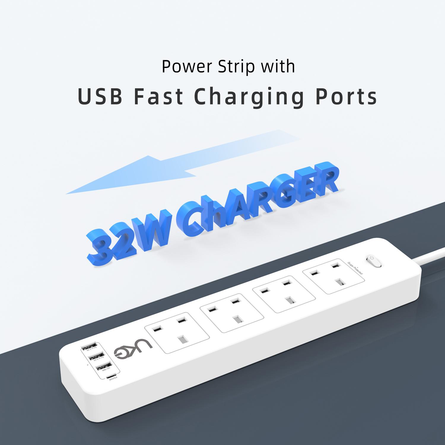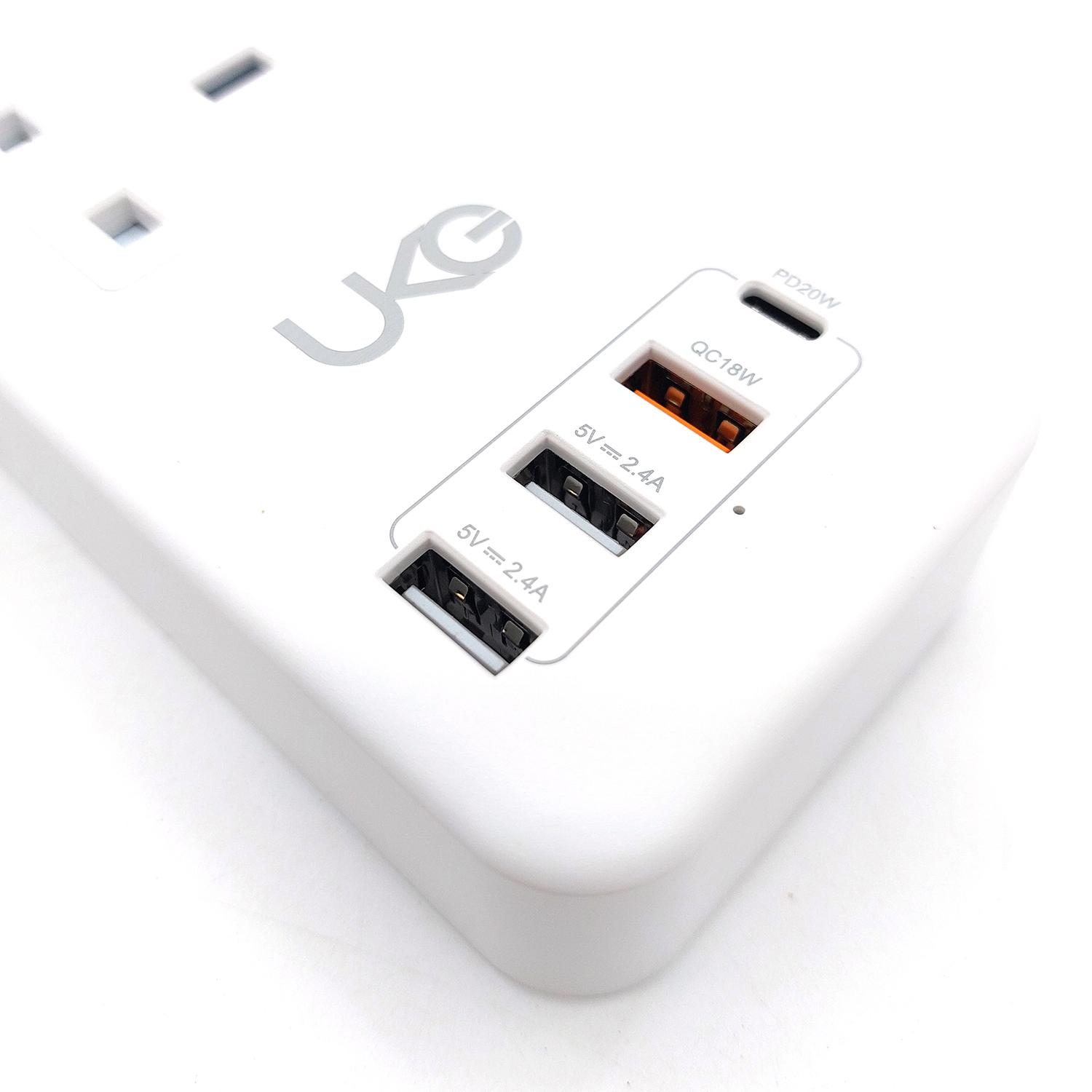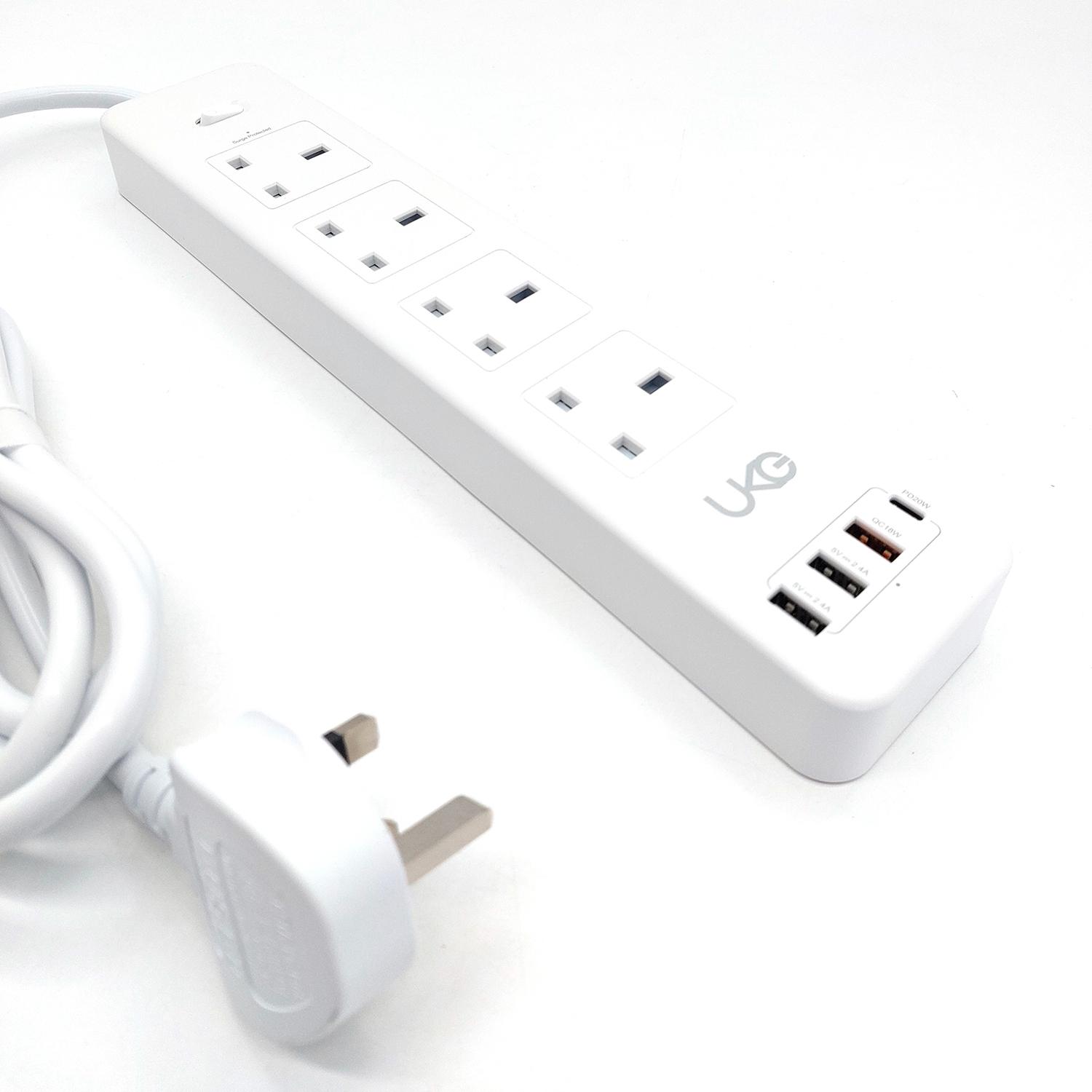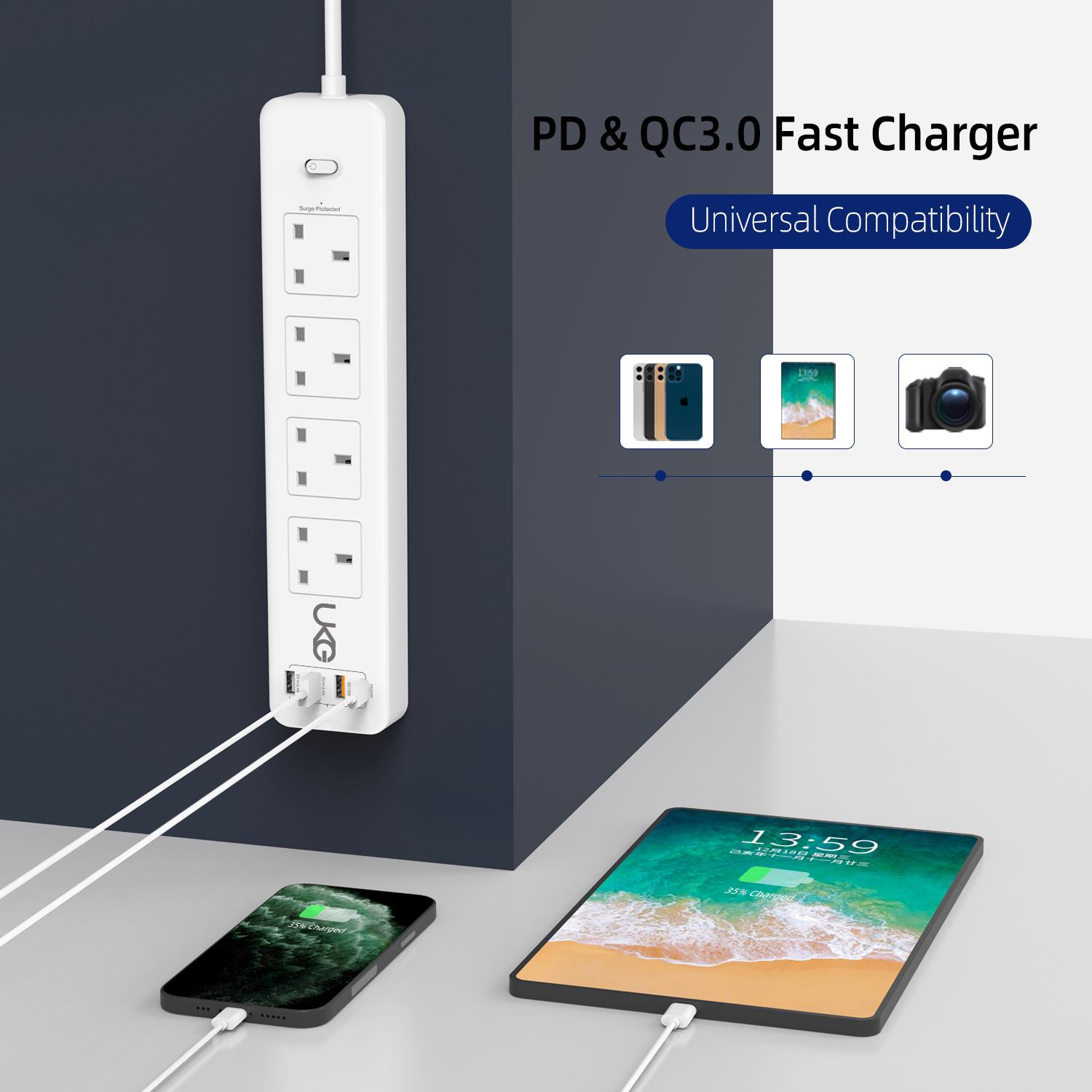 白色4位13A帶總開關+4USB(1xUSB-C PD&QC3.0+3xUSB-A) 2米電線長條形拖板