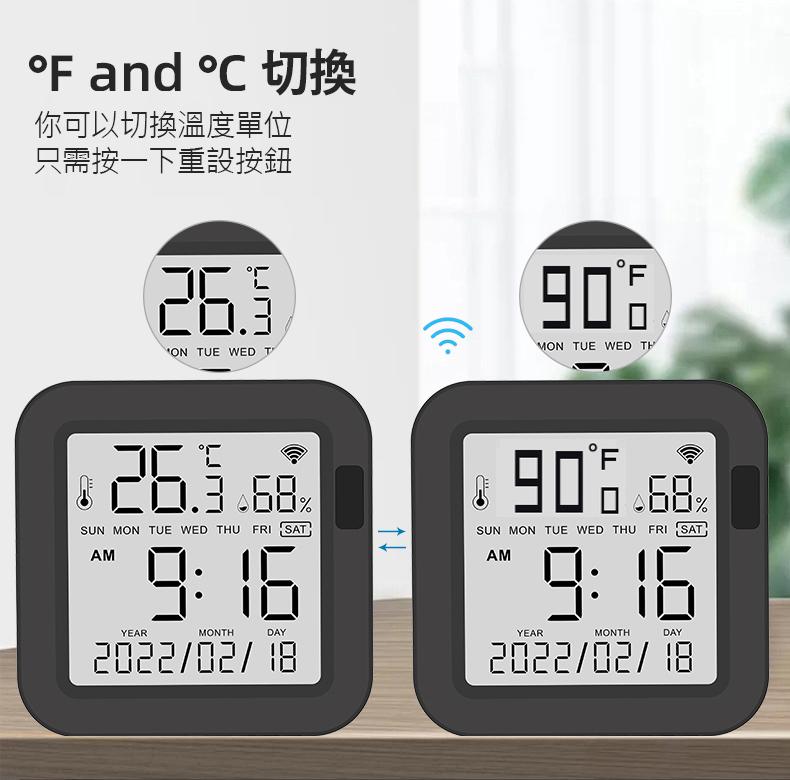 °F 和 °C 切換:只需按一下復位按鈕,即可在 °F 和 °C 之間切換溫度單位。