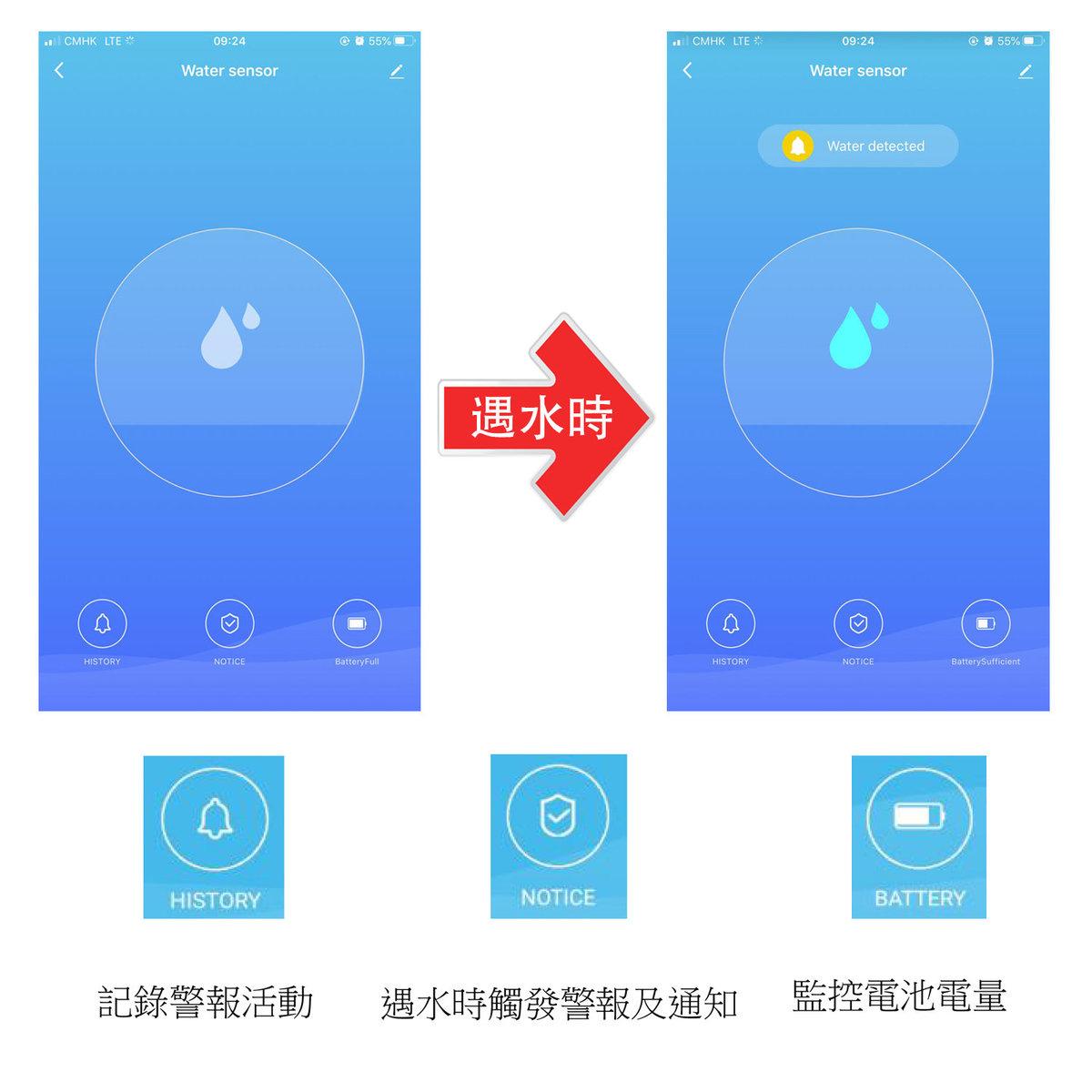 開啟感應器,再將感應器的接點放入水中,手機App有提醒表示感應器正常。