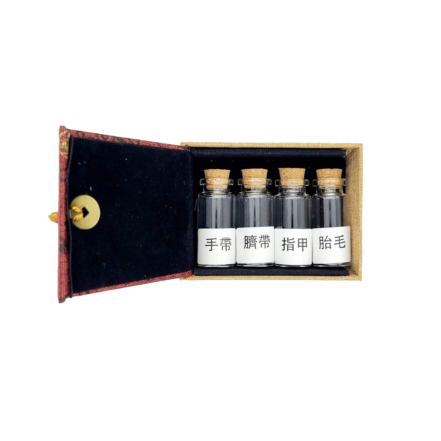 禮盒有大盒和小盒兩款,大裝禮盒內放有四個玻璃小瓶子,分別貼上:胎毛、臍帶、乳齒、指甲小標籤;小裝禮盒內放有三個玻璃小瓶子,並都配上精選木塞,能長期封存。