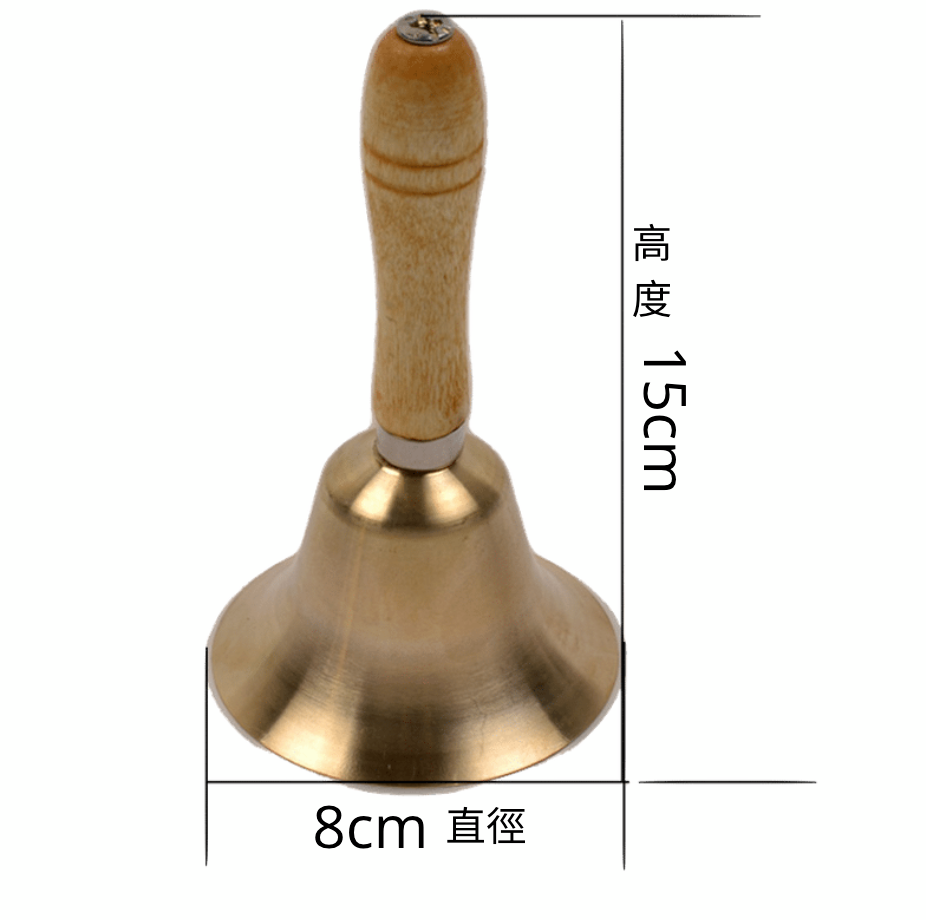 8cm 精美銅響鈴 材質 : 黃銅 呎吋 : 高約15 cm / 闊 8 cm 重量 :121g 銅鈴手工精美,用途廣泛 --- 聖誕老人專用手鈴 --- 下、上課鐘聲 --- 小朋友遊戲 --- 提醒注意響聲