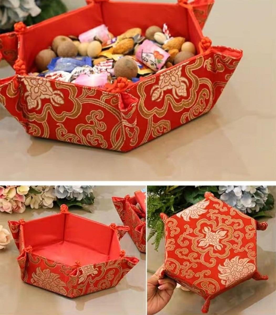 名稱 : 綢緞糖果盤(VNY-BOX-23CM) 材質 : 綢緞 呎吋 : 摺疊後直徑23cm x 高7cm 特點 : --- 大紅綢緞,增添喜慶感 --- 設計新穎,手工精細 --- 中國結式盤扣,圍邊齊整 --- 輕易拆開或摺疊 --- 六邊形設計,六六無窮 --- 可循環再用多次